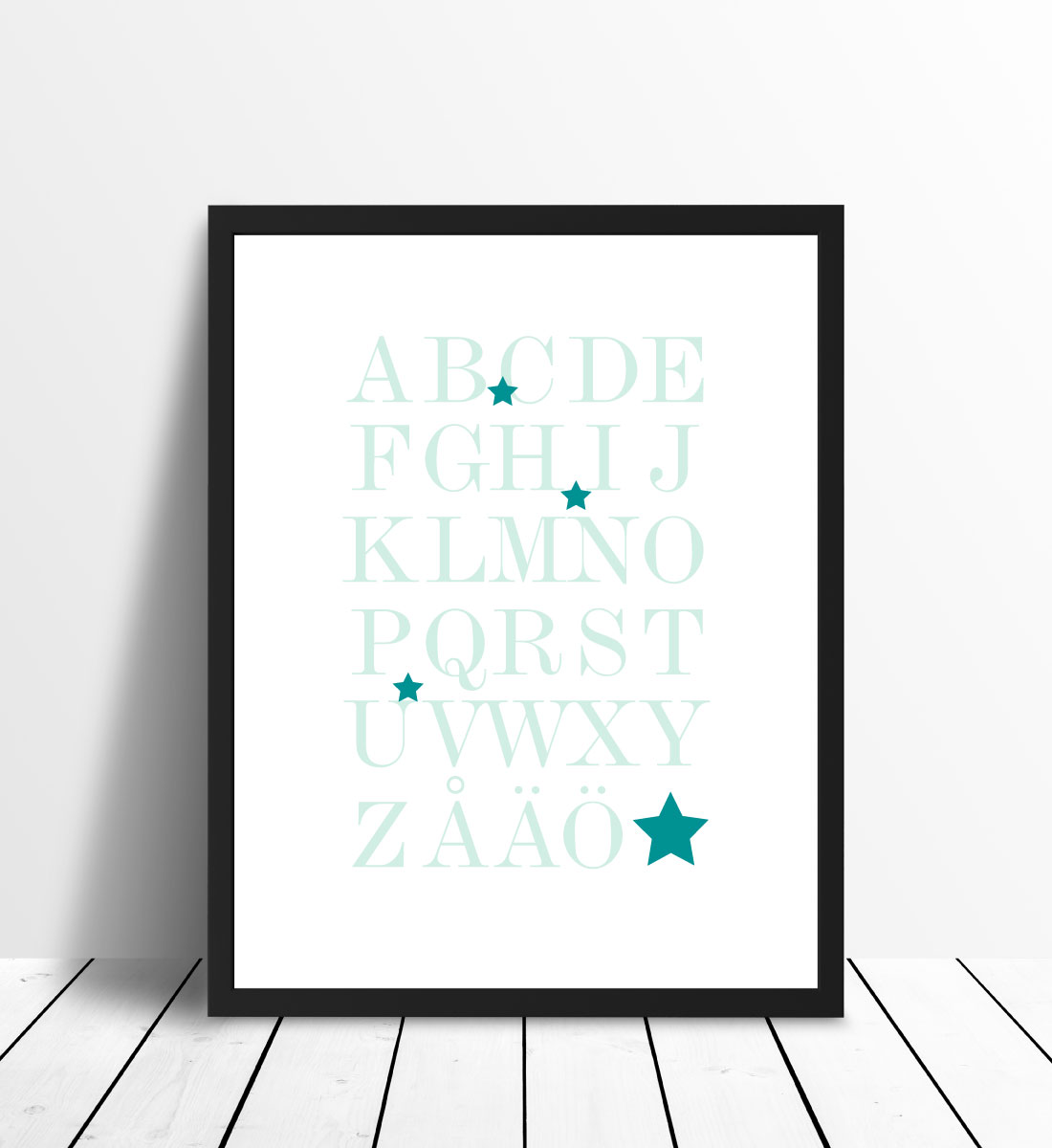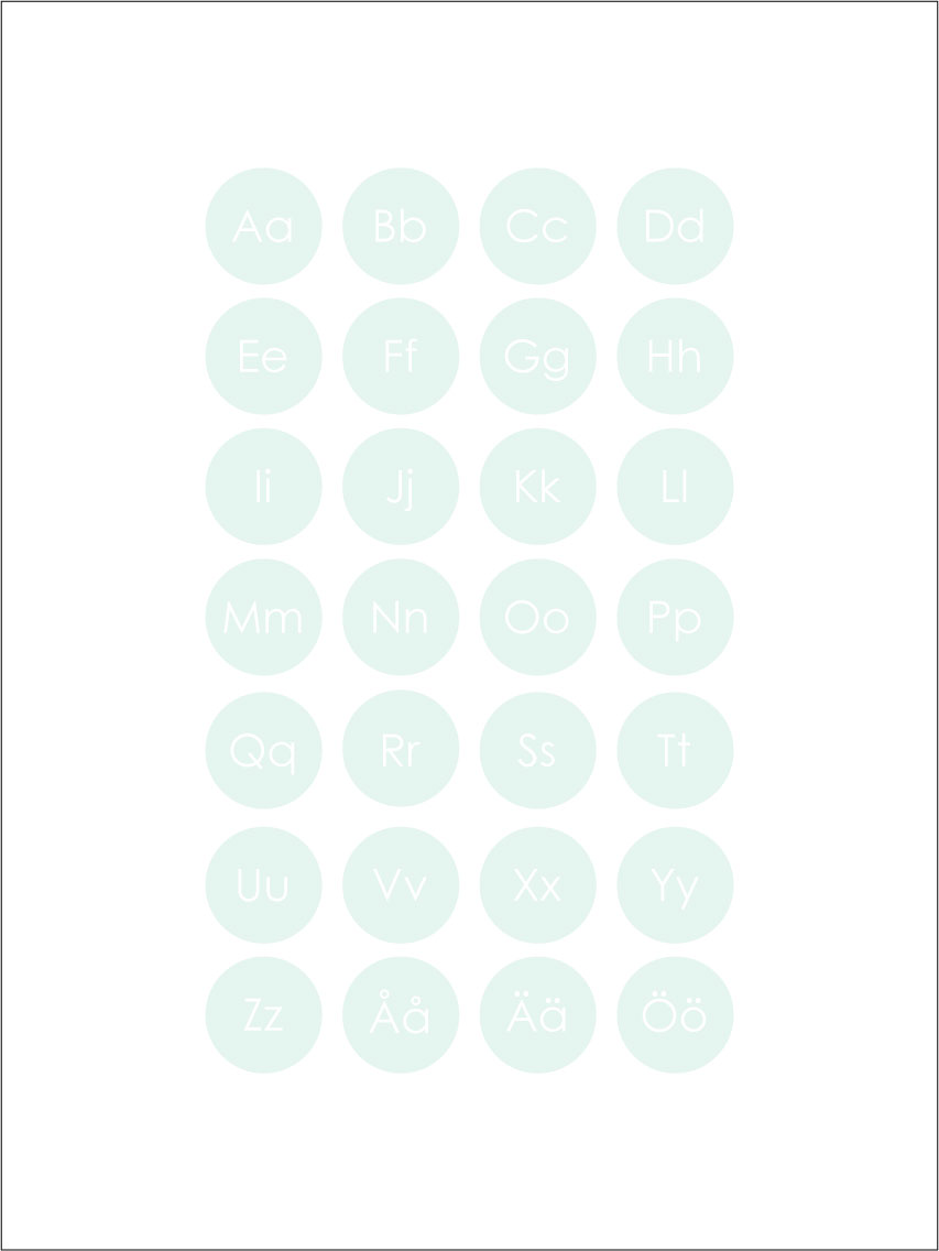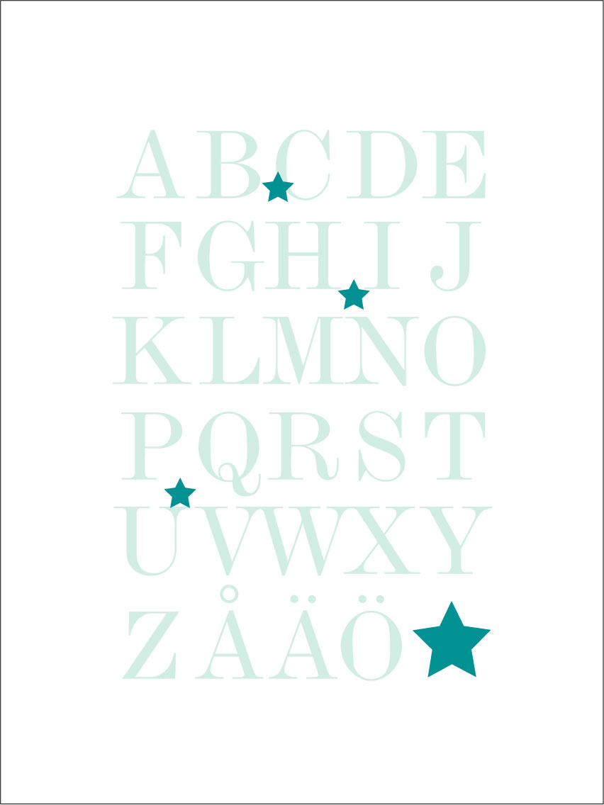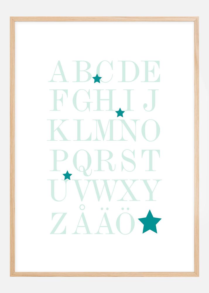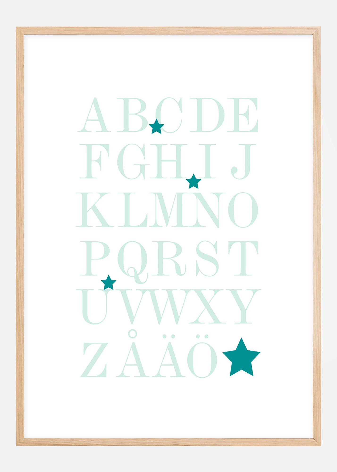 Graphic print featuring the entire alphabet, A-Ö, in the sea's green-turquoise shades. The educational motif is well suited for children's rooms to practice the alphabet, but also fits well on other walls in the home. The sleek expression means that the poster fits in with all interior styles and types of homes. Feel free to combine with other paintings for a themed gallery wall or decorate the wall along with the poster featuring the numbers 1-10.
