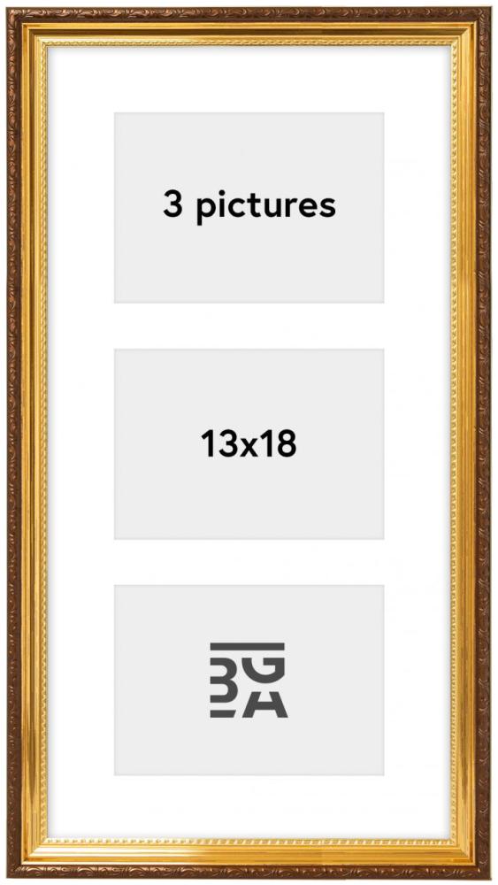 With this collage frame, you can decorate your walls with pictures of family, friends and the wonderful memories you’ve captured in photographs. The frame has space for 3 pictures 13x18 cm. The gold-coloured frame has a beautiful retro style with decorative detailing in a warm brown shade. Wall bracket included.