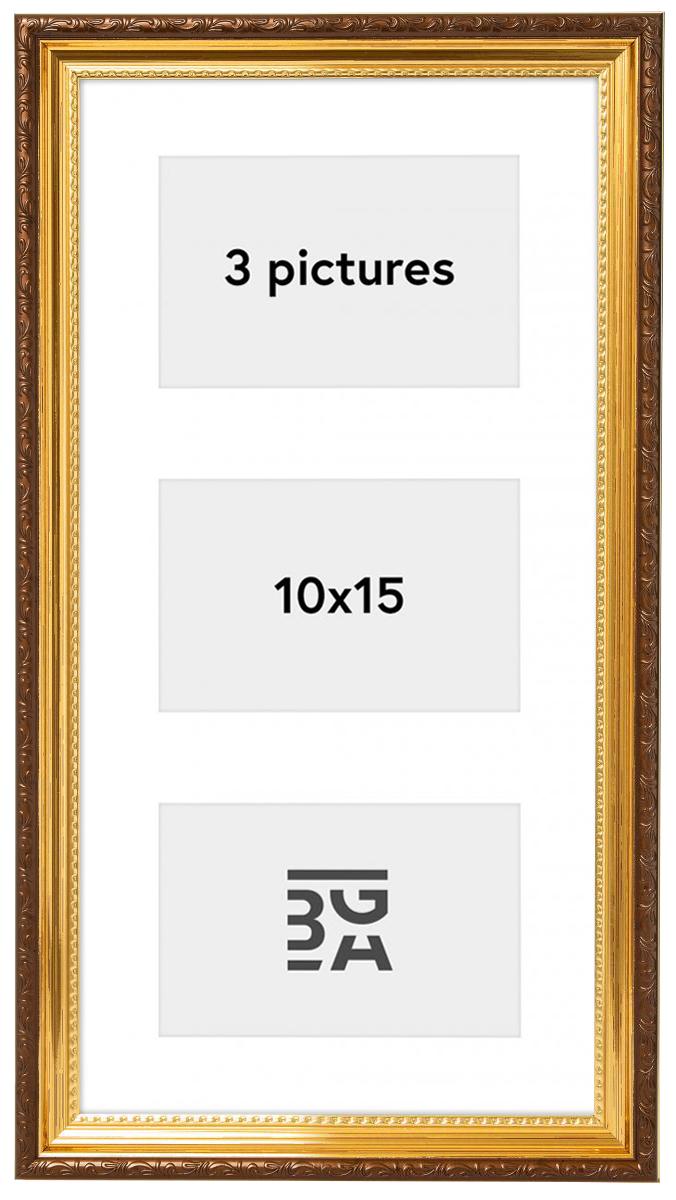 With this collage frame, you can decorate your walls with pictures of family, friends and the wonderful memories you’ve captured in photographs. The frame has space for 3 pictures 10x15 cm. The gold-coloured frame has a beautiful retro style with decorative detailing in a warm brown shade. Wall bracket included.