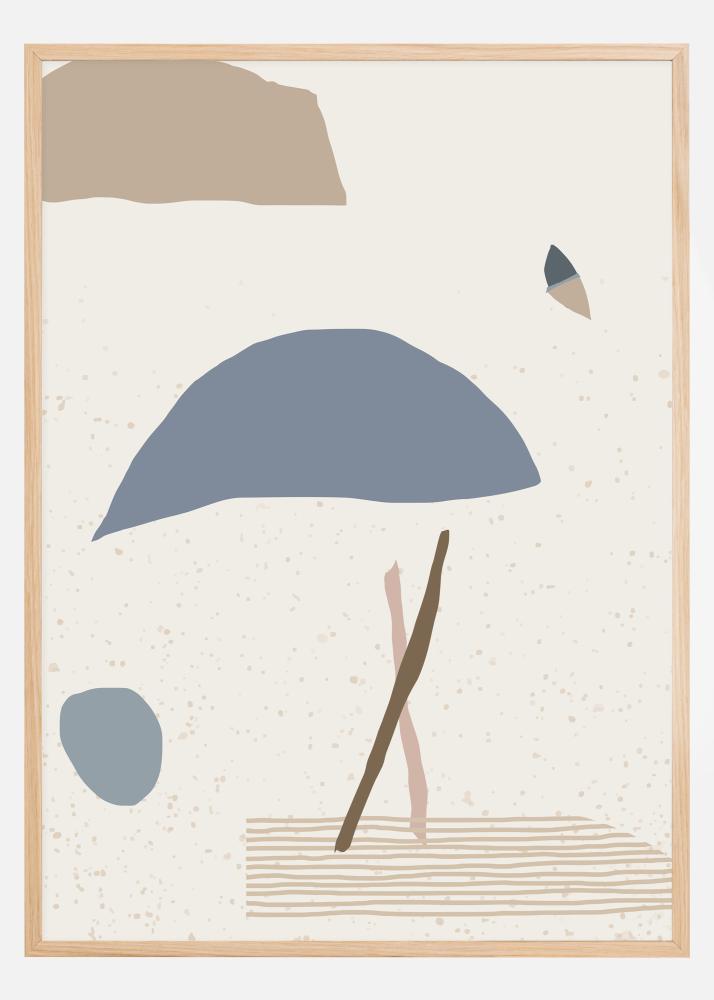 An abstract poster with blue, brown and grey shapes on a white background. See what you want to see in this minimalist piece that gives the feeling of a person, umbrella, ball, butterfly and cloud. Bring the gallery to your home with this contemplative art poster and discuss its meaning.
