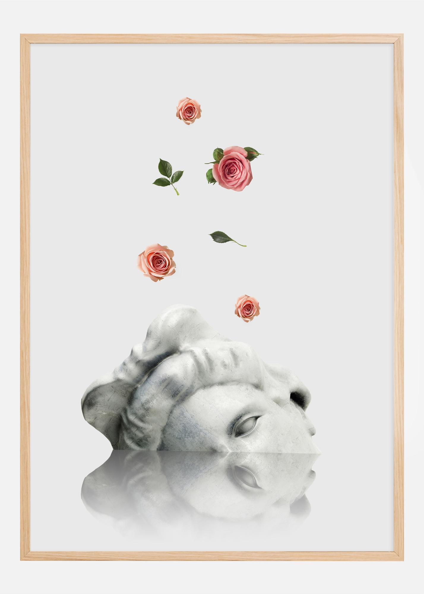 This artistic poster presents a dreamlike composition where a sculpture of a face, which seems to sink or dissolve, is surrounded by swirling roses in various stages of blooming and foliage. It is a captivating image that unites the beauty of stone and flora, offering a sense of both timelessness and transience.