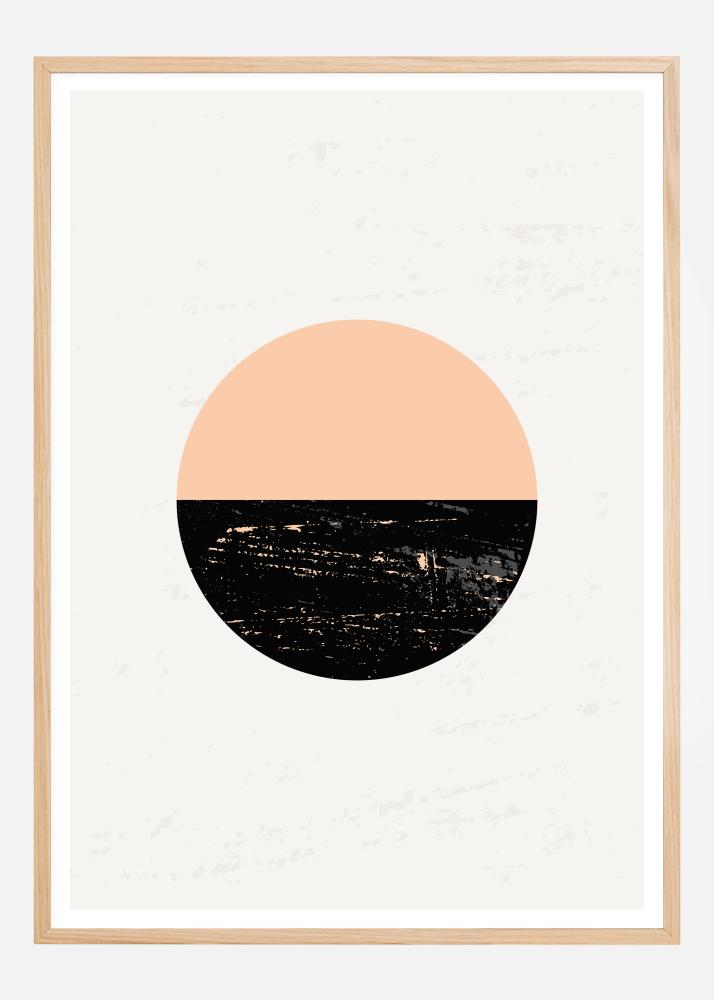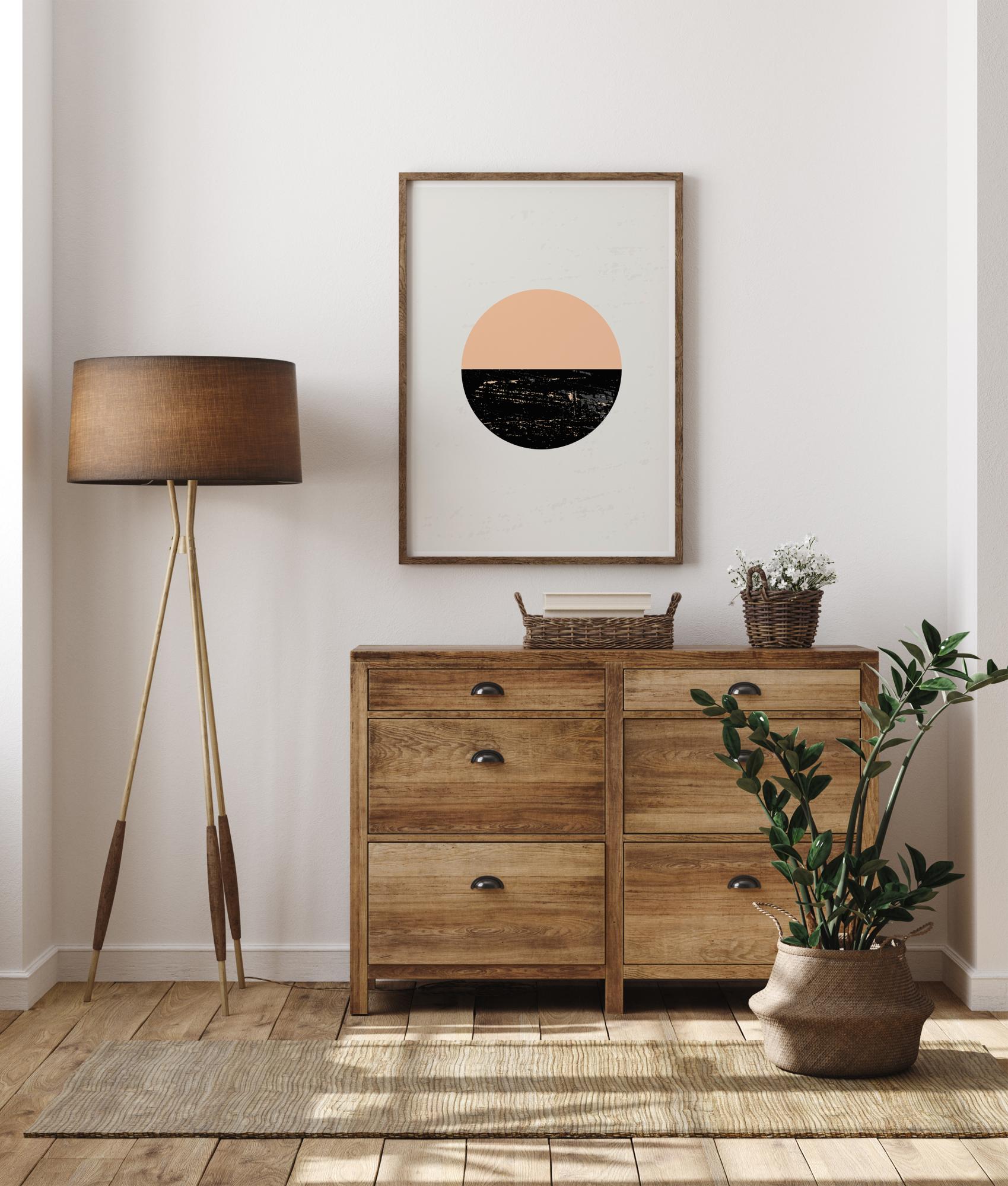 A minimalist poster of a circle in two different colours. The circle is on a white background with the top half a soft peach or pink. The bottom half is black with a design of a cityscape at night, the lights twinkling in the black. Create conversation when bringing this home.