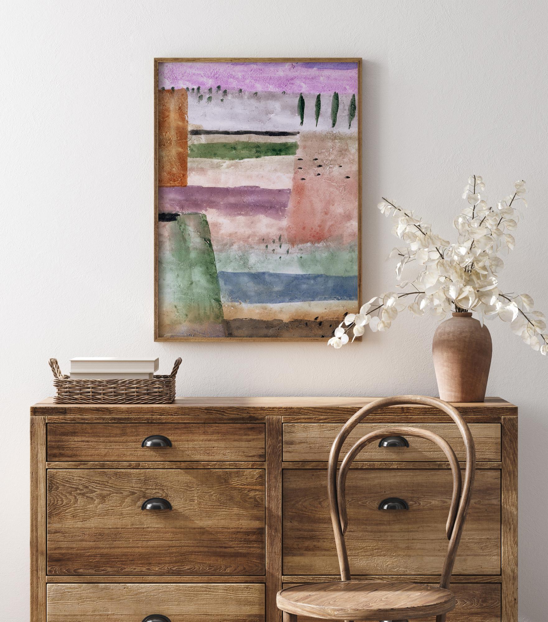 A pastel abstract poster with a layered, textural feel. The poster has what appears to be a beach, the sea, mountains, grass and trees fading off into the distance. There's a range of blues, purples, oranges and greens all in soft pastel. This tranquil scene will set your mind at rest.