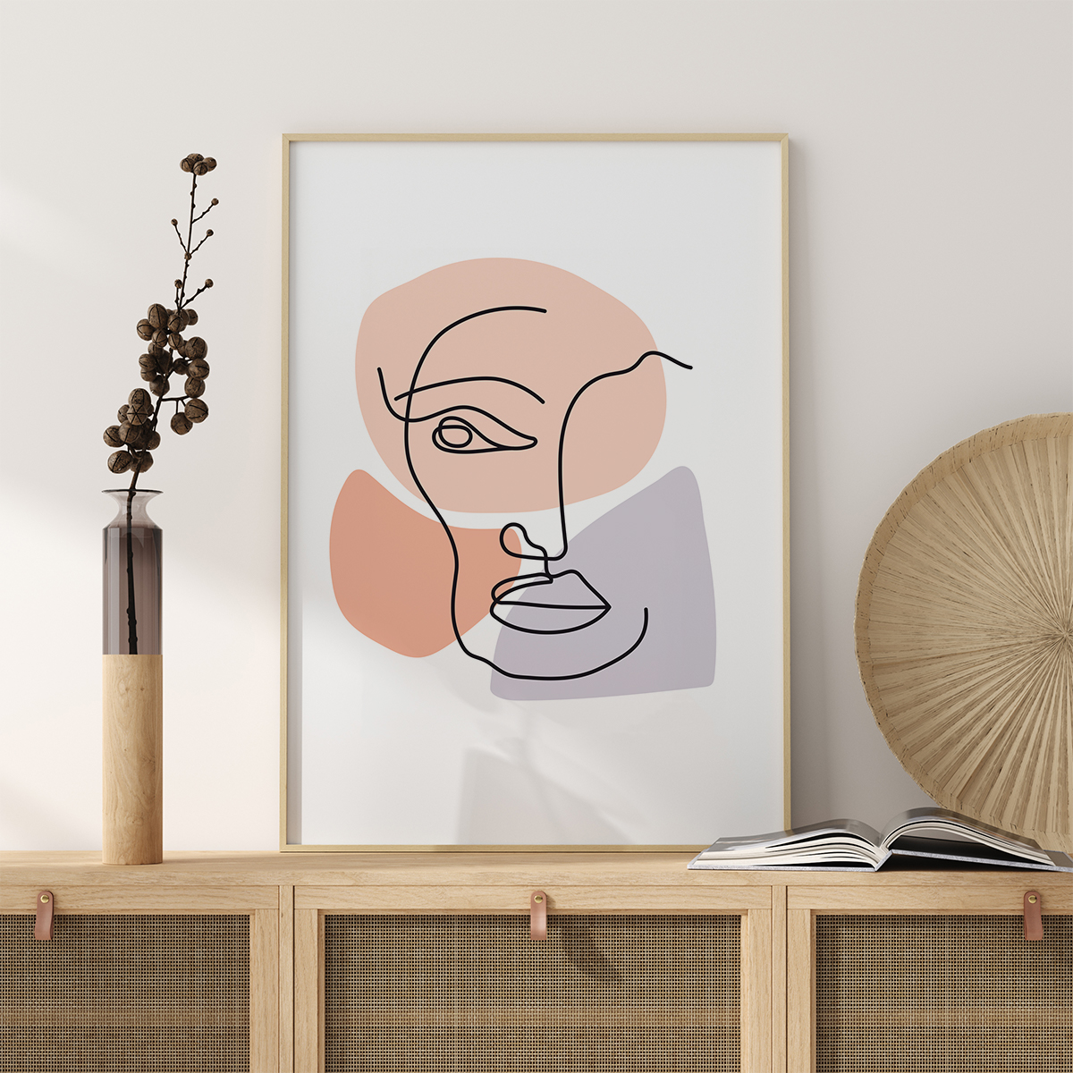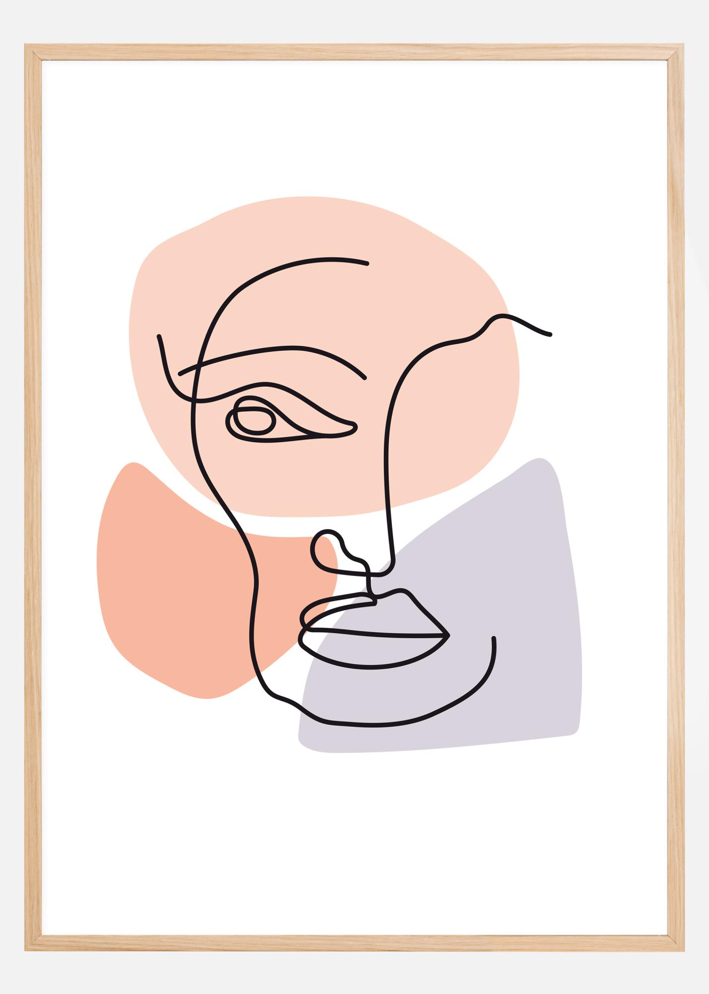 A curious abstract poster of a contemplative face. Thin black doodled lines create the nose, eyes, mouth and chin of this watchful face. Soft blues, pinks and peach shapes site underneath to give form to the face. Pair with a strong feature wall for a real statement piece and great imagination.