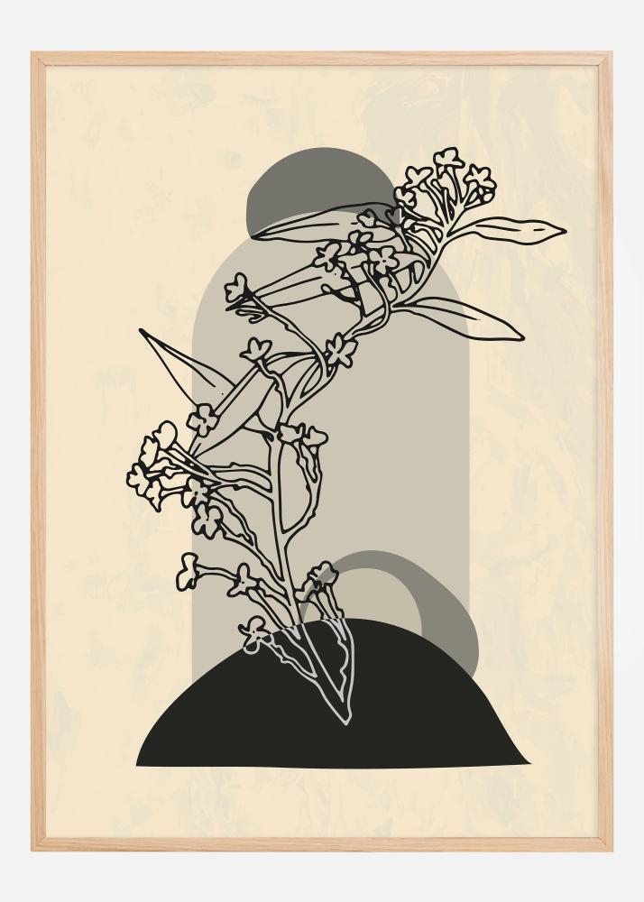 This sophisticated poster depicts an abstract floral arrangement that combines natural shapes with graphic elements for a contemporary feel. The motif uses a subtle color palette with soft beige tones and bold black lines, creating a contrast that is both striking and elegant. The design places great importance on composition and balance, positioning the organic shapes of flowers and leaves over a solid black semicircle, which creates an illusion of shadow and depth.