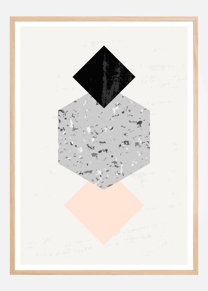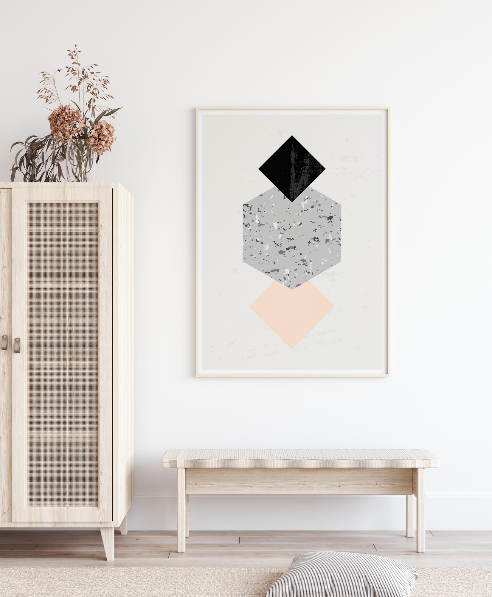A geometric abstract poster with two different squares. Though 2D, the angles of the squares trick the eye into seeing cubes. These cubes are filled with fun pebble and speckles of colour in blue, grey and black. Create a dramatic wall when matching this simple piece with a bold color wall.