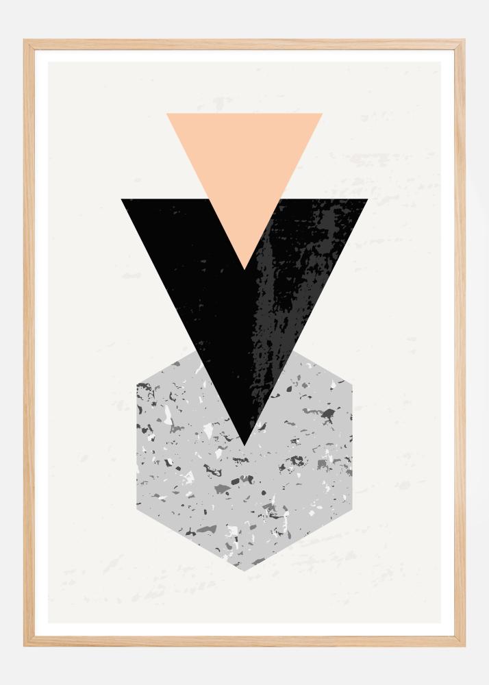 A triangular geometric poster with bright, bold shapes. The two triangles in pink and black point the way down, leading the eye to the softer blue and dashed cube. The central black triangle holds the focus making this a perfect home office piece with its less distracting design compatible with any room.
