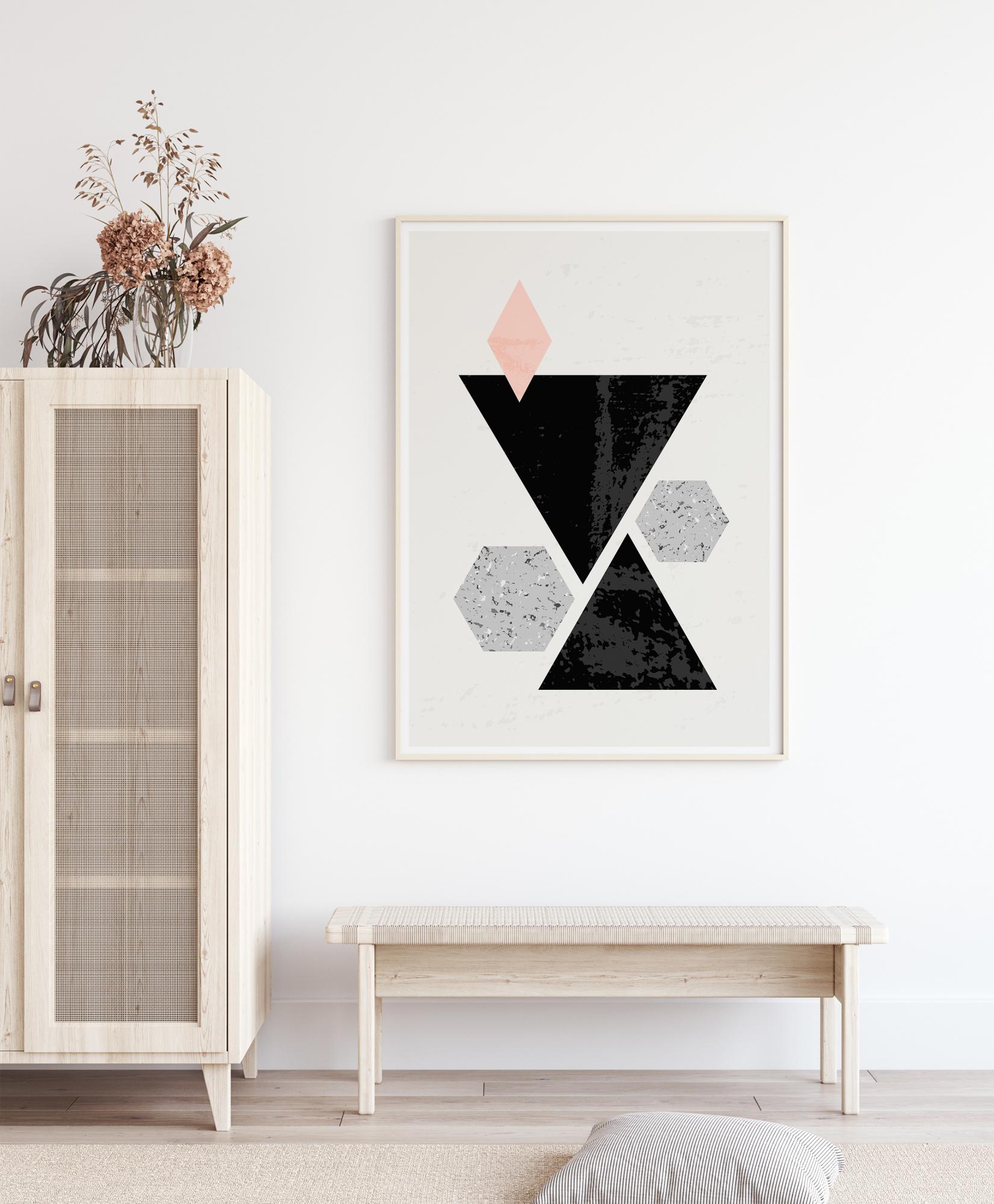 A strong geometric poster full of abstract shapes all fitting together in a cohesive design. Two large black triangles line up together like an hourglass. Around them is a pink diamond and two blue pebble-dashed hexagon shapes, each fit neatly into this strong interesting image. Hang in a hall to make a statement.
