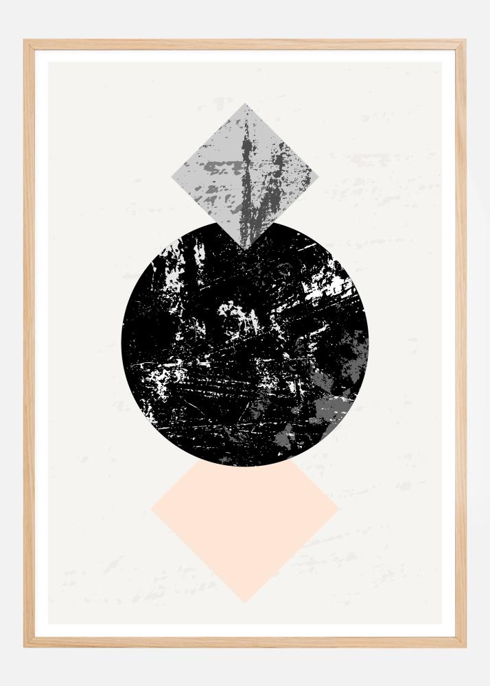A geometric abstract poster with two squares surrounding a circle. The black circle has white marbling and is flanked by a blue marbled square and a pink square. Each sites on a point focusing the eye to that Earth-shaped circle in the centre. Bring drama to a simple wall with this statement.