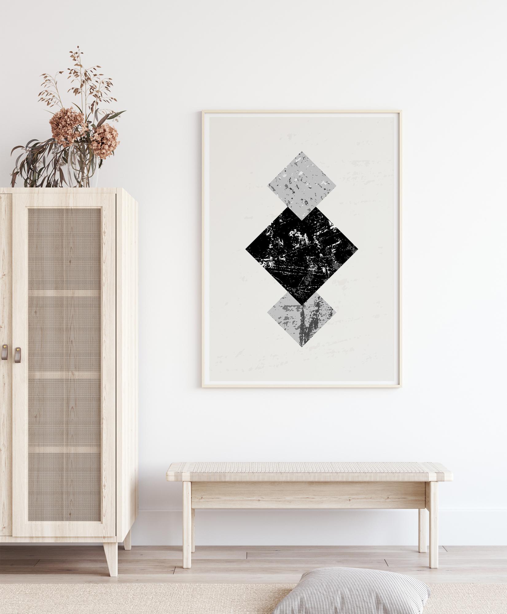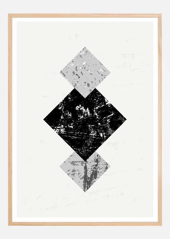 A geometric poster of three squares sitting in the centre of a white background. The large square in the centre is black with marble effects. Each site are two smaller blue squares with marble and pebble-dashing effects. The eye is drawn through the piece by the points of each square in this near symmetrical work.