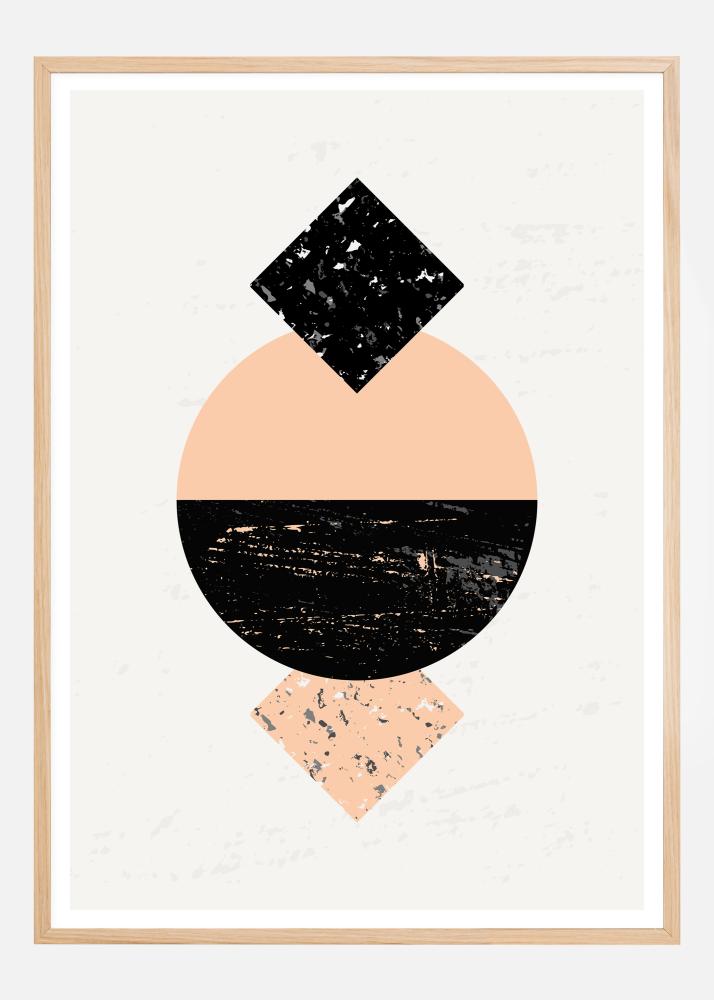 A contrast geometric poster of abstract squares and circles. The large circle in the centre is divided into a peach top half and a black bottom half that looks like a city at night. For contrast, a pink square rest against the black, and a black square sit on the peach of the circle.
