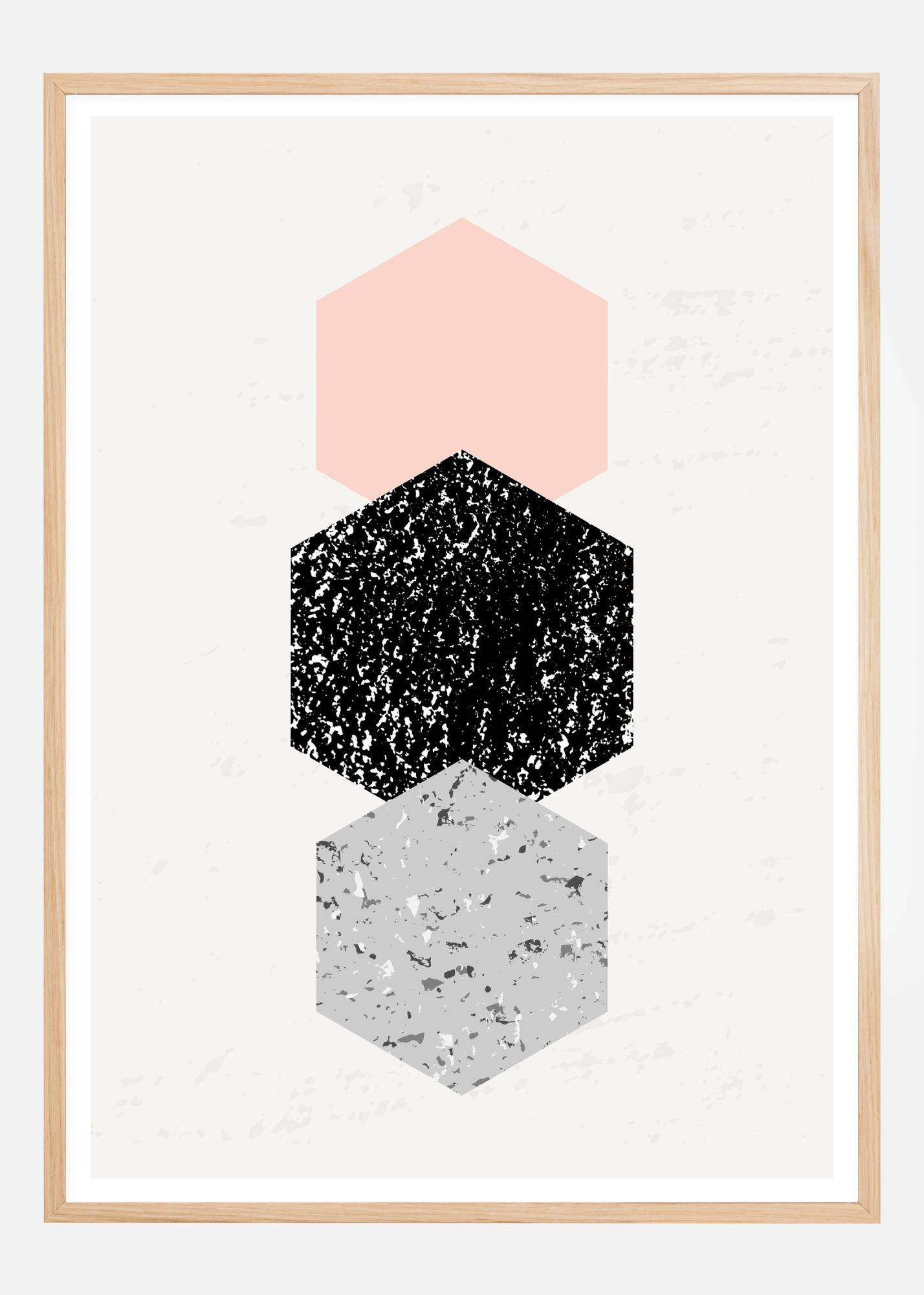 A hexagon abstract poster featuring three hexagons on top of one another. The top is a soft pink, the larger middle is a black and white speckled shape, and the bottom is a blue pebble-dashed hexagon. The eye follows through this piece, with no distractions perfect for a home office.