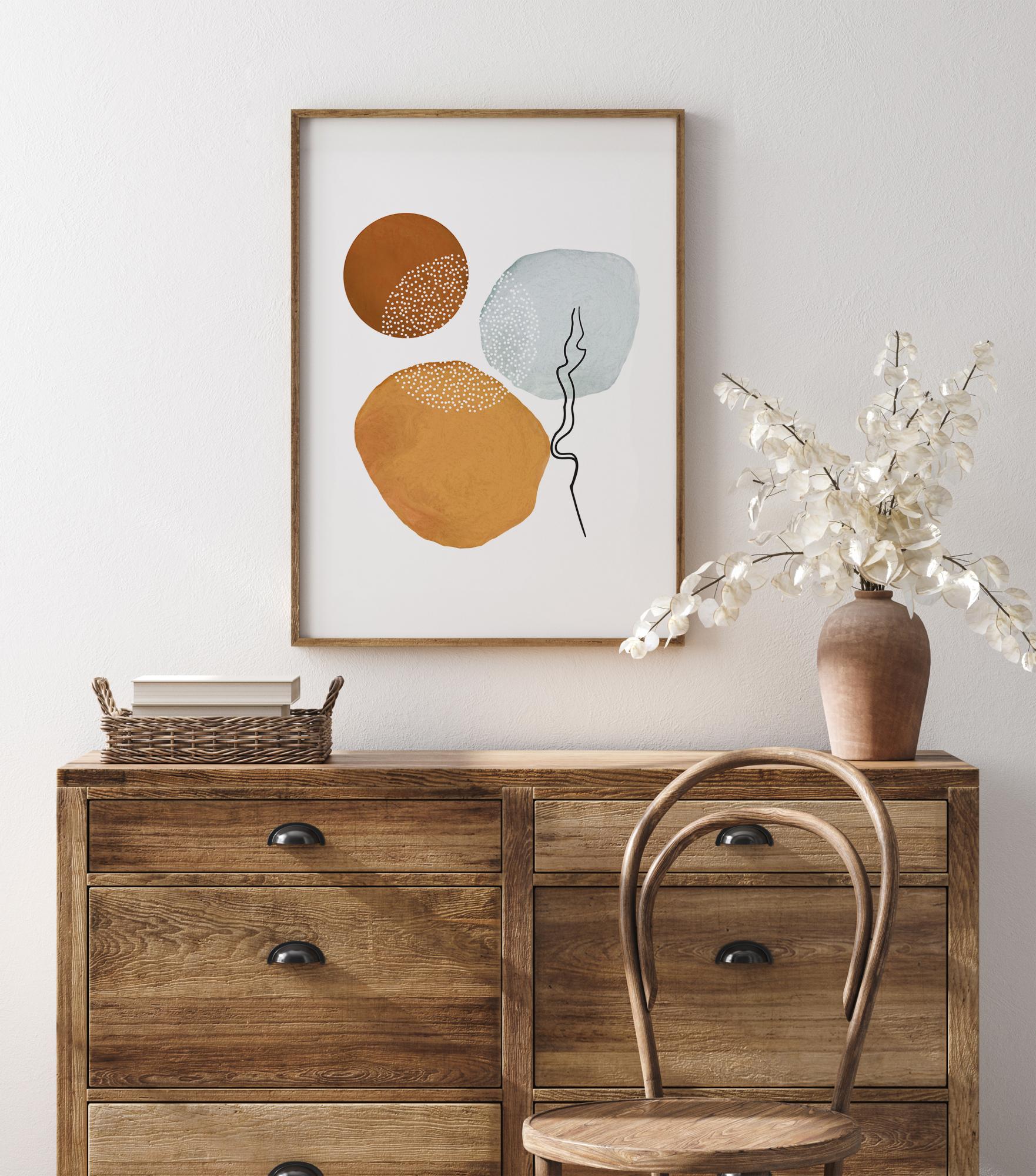 A simple abstract poster with three main circular shapes. Overlapping these three shapes is a circle made out of small white dots like a dandelion clock. Two simple lines wiggle across the blue shape bringing the piece together as one. This print makes a great addition to a sophisticated gallery wall.