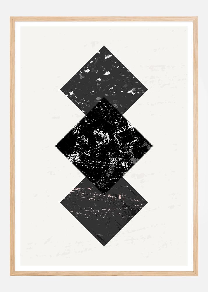 A geometric poster with three dark squares sat on their points. Two navy blue squares sit top and bottom of a larger black square. All are emphasised with white spots and flecks across them to create an interesting set of patterns. Match this with a blue wall and let these shapes standout.