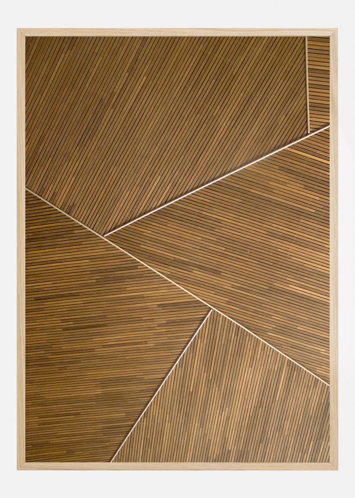 A wood pattern poster of abstract geometric shapes. Think planks of wood interlock in this simple pattern. The angles of the planks lead the eye around the piece, with the white lines providing impeccable focal points. Make this a statement on a simple neutral or white wall in your home.