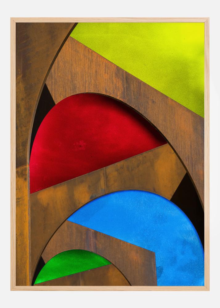 A bright abstract poster of colourful shapes. Primary colours fill this piece with red, yellow and blue semicircle shapes. Interlocking these shapes are straight edged wood effect images with a green slice at the bottom. Add vibrancy to a plain wall or match with an existing bold colour to bring out the complete look.