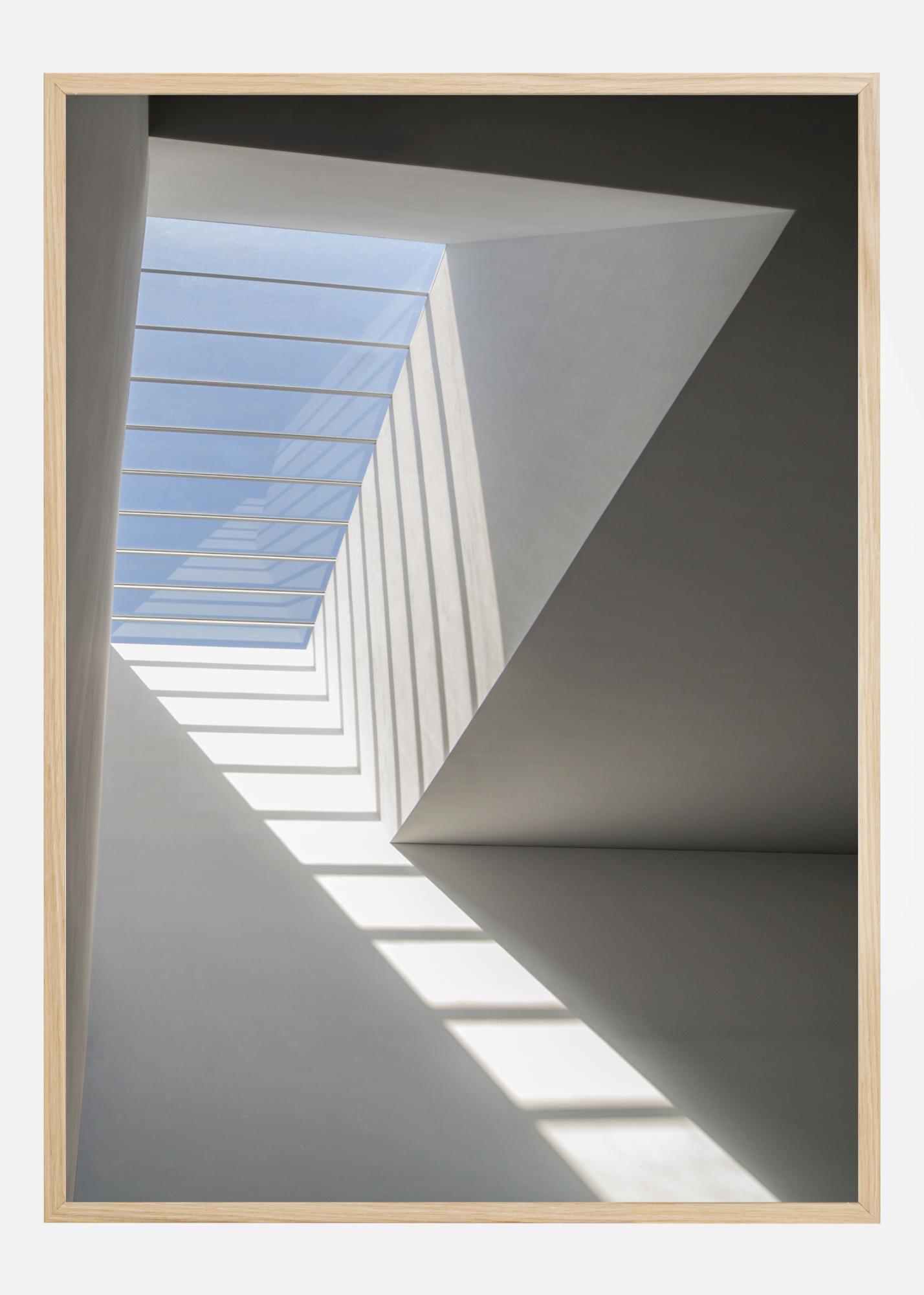 A simple airy poster of a bright white room interior. A dormer window sits to the left where blue sky can be seen. The light streaming through casts shadows that look like a ladder leading the eye up to that light outdoors. Add brightness to a dark room with this peaceful image.