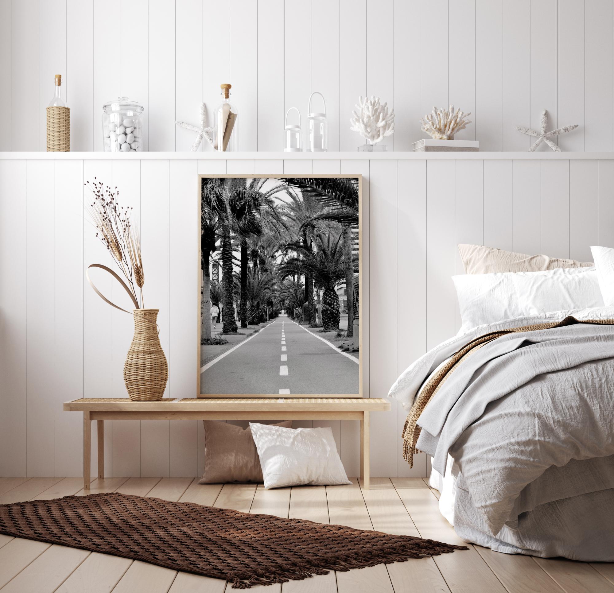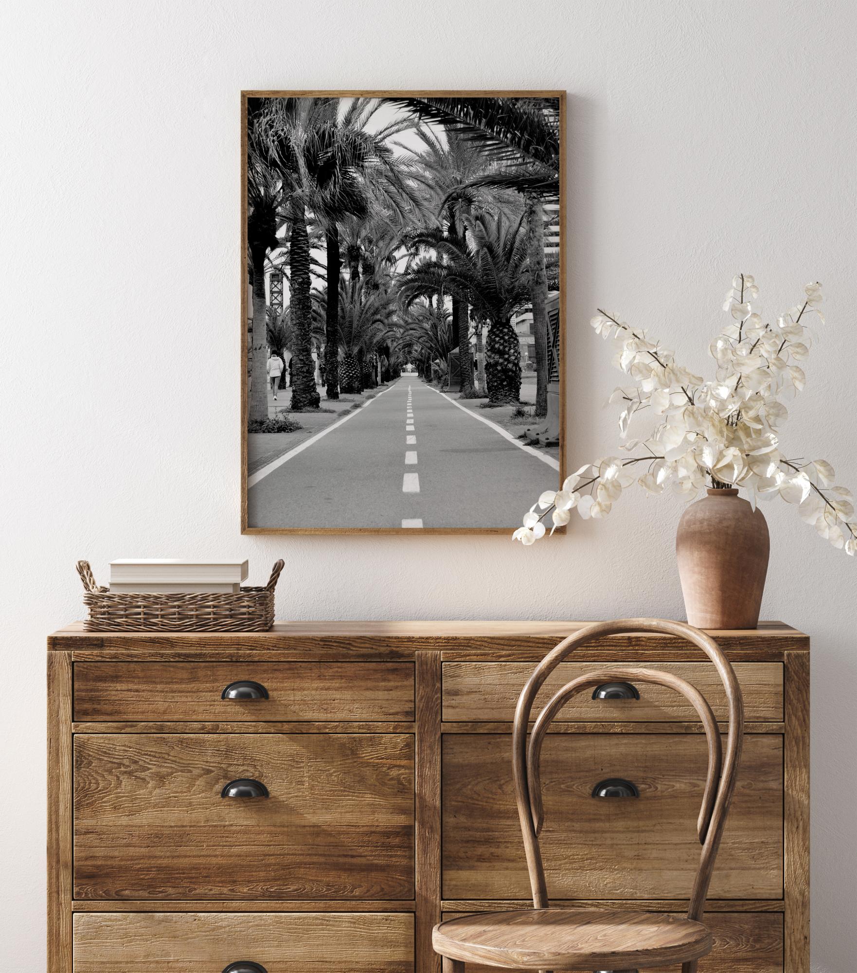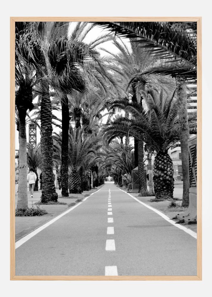 A landscape poster of a stretch of road running through a grove of palm trees. The palms create a border to the road as the white lines lead you into the far distances. The trees create an arch funnelling your eyes. Add this black and white beauty to your wall for an exotic vibe.