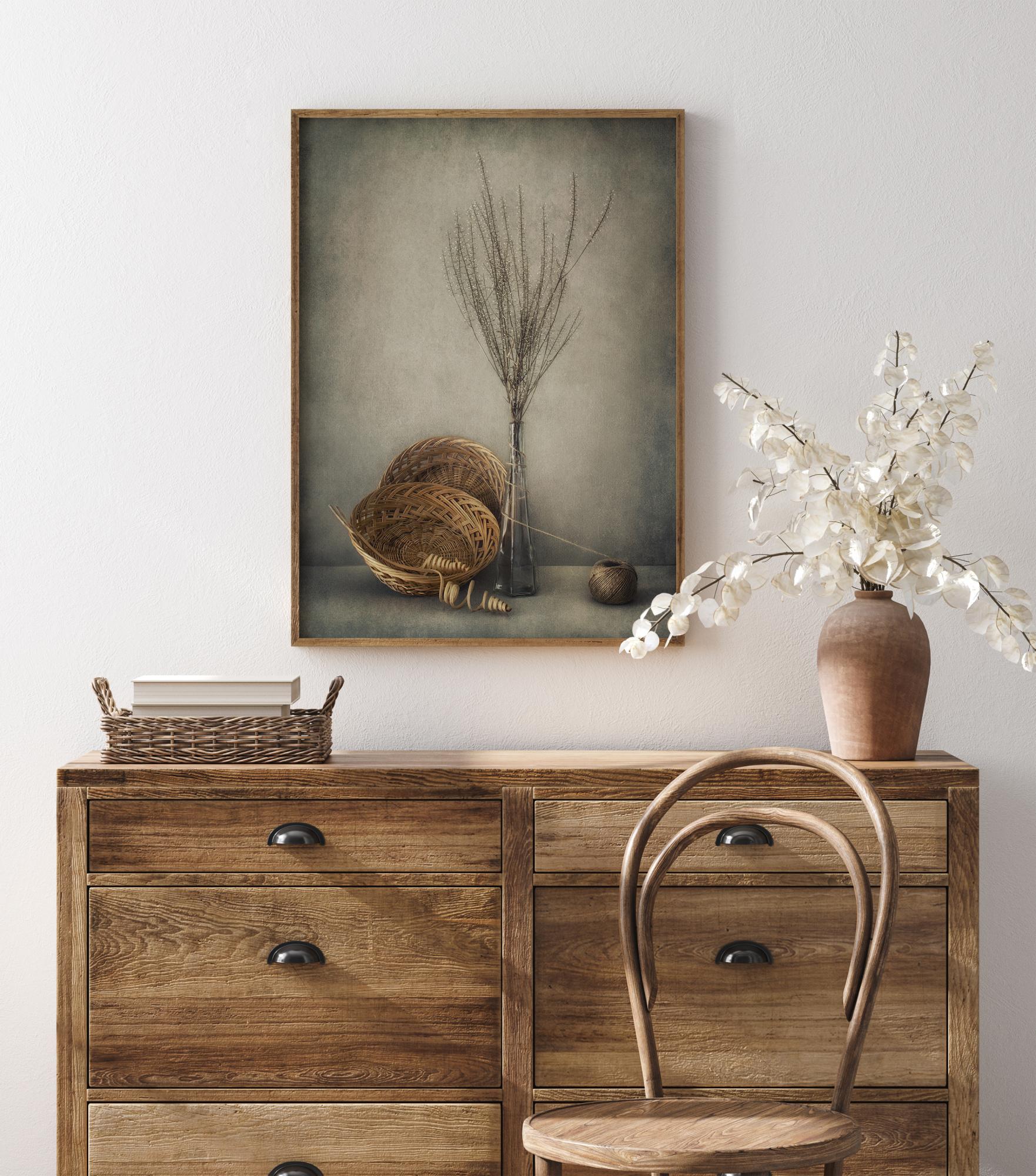 A still life poster of wicker baskets, a clay pot, a glass flask with dried grass. The piece has subtle sepia and grey tones keeping this a soft and harmonious piece. Bring a little tranquillity into your home with this poster and pair it with a neutral wall so it's not overpowered.