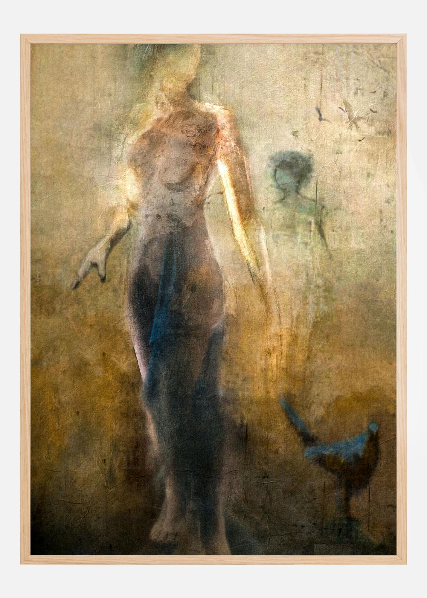 Capture the eye with this mysterious and suggestive poster that seems to tell a story beyond the visual. The motif explores themes of identity and memory through a figure emerging from a grunge-inspired background. The abstract element of the artwork emerges through the diffuse, almost ghostly, appearance of the figure and the subtle hints of a silhouette in the background, while a lone bird seems to soar freely.