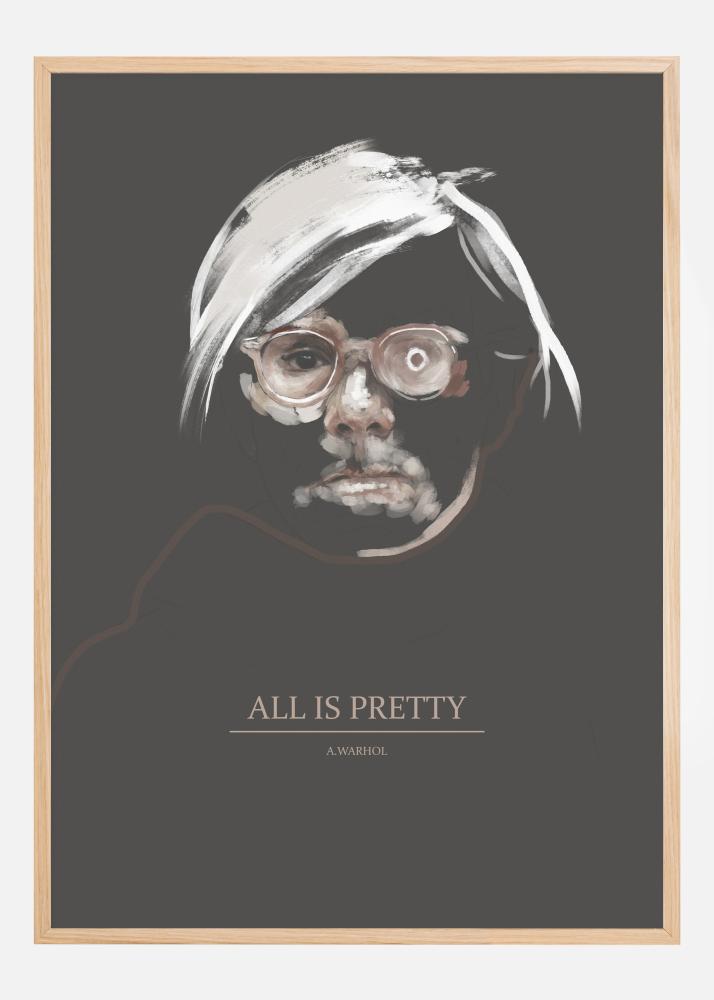 An artist poster of Andy Warhol. This portrait of the artist shows his shock of white hair and focuses on his eyes, one calm, one wild. A slogan All is Pretty sits at the bottom to give you an inspirational quote and message whenever you walk past this in your home.