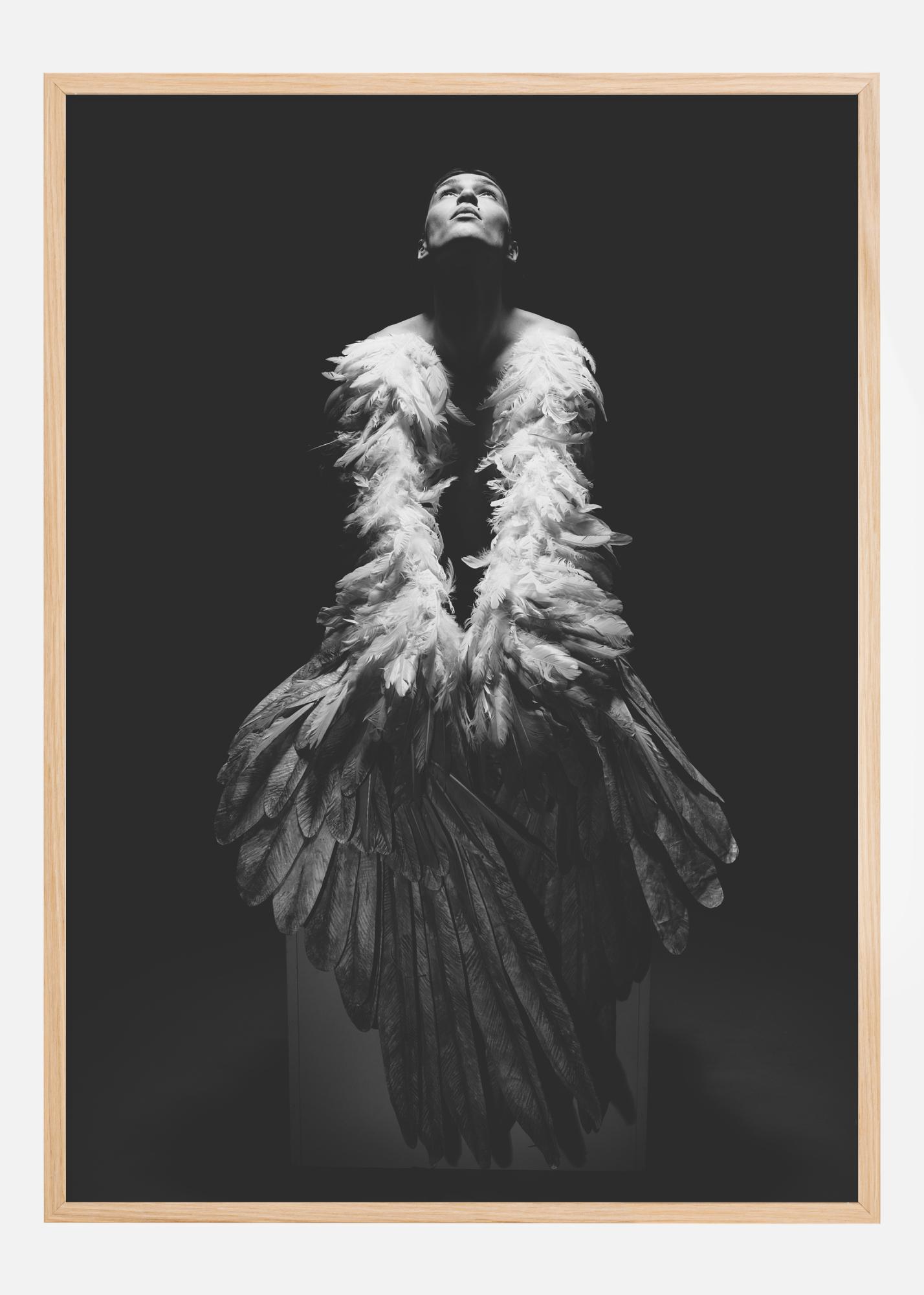 A portrait poster of a man in a long-feathered outfit to mimic flight. He stands against a plain black background and stares up toward the sky. A spotlight shines from above highlighting his face and shoulders so that you focus on him when you gaze at this dramatic piece.