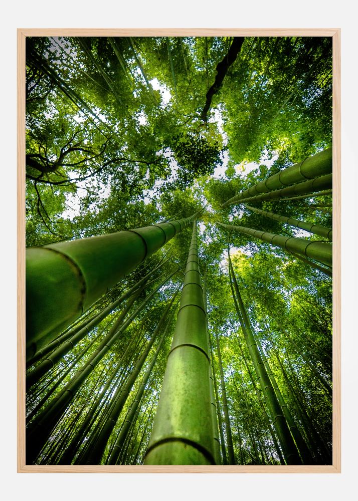 A nature poster of strong green bamboo plants. Look up to the skies as this image is enclosed with thick bamboo stems leading up a leafy green canopy up in the sky. Imagine you're lying down in this tranquil jungle world when you bring this piece into your home.
