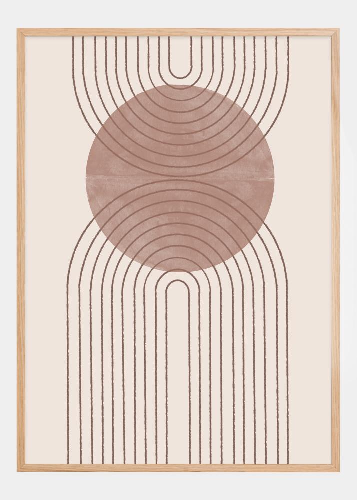 This poster invites a sense of calm and organic flow with its soft, sweeping lines that gather around a central circle in a warm, terracotta hue. The soothing pattern resembles sand dunes shaped by the wind, or gentle waves rolling in towards the shore, offering a moment of reflection and tranquility.