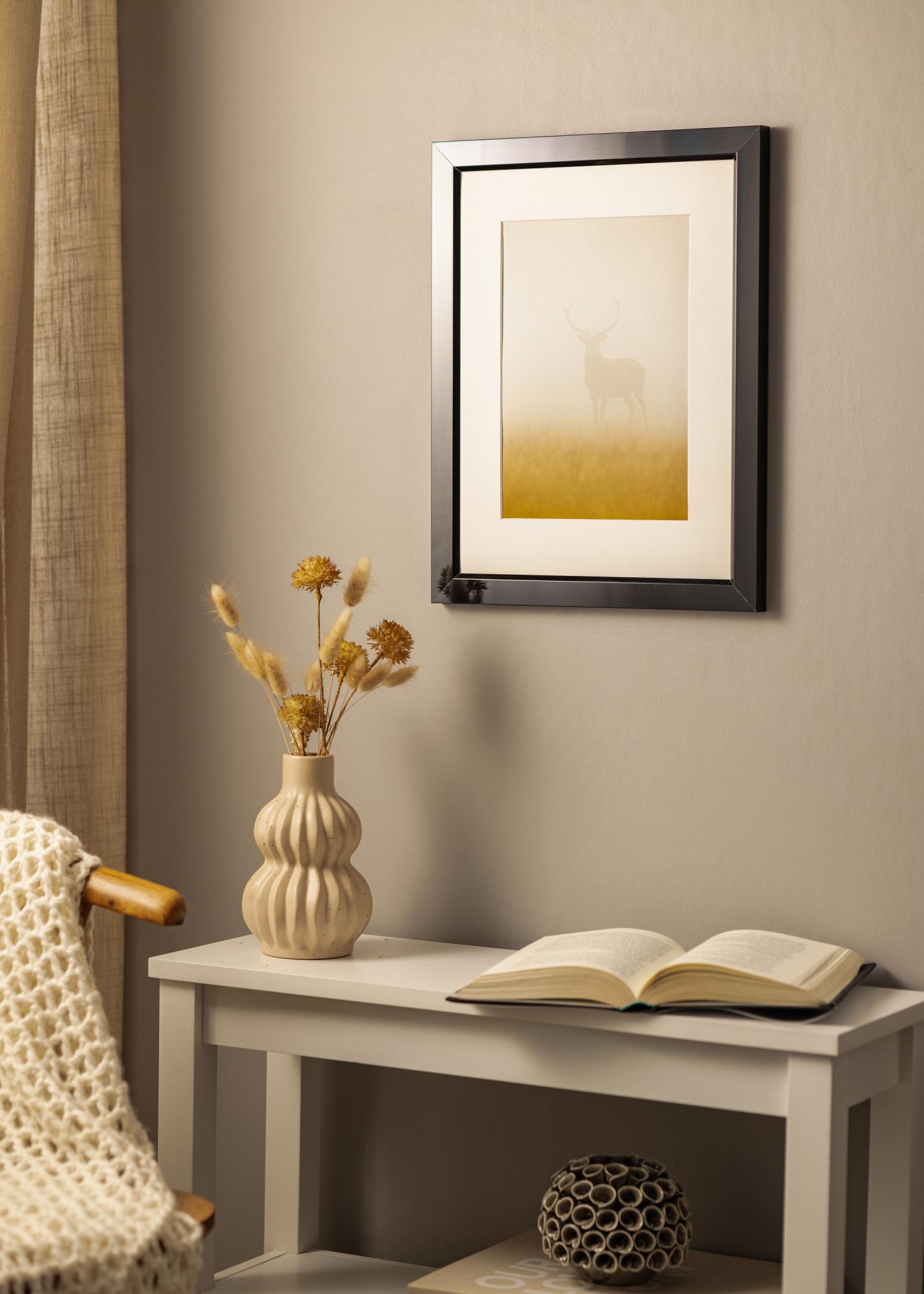 A black, stylish, high-gloss picture frame that's made of aluminium and has a clear inner bevel. The frame is great for everything from photographic portraits to watercolour paintings of landscapes, especially if you enhance the picture further with a white mount. The glossy lacquer makes the picture frame fit particularly well into modern industrial interiors and spaces of other minimalist styles. Combine it with other black picture frames to give the room a uniform look.