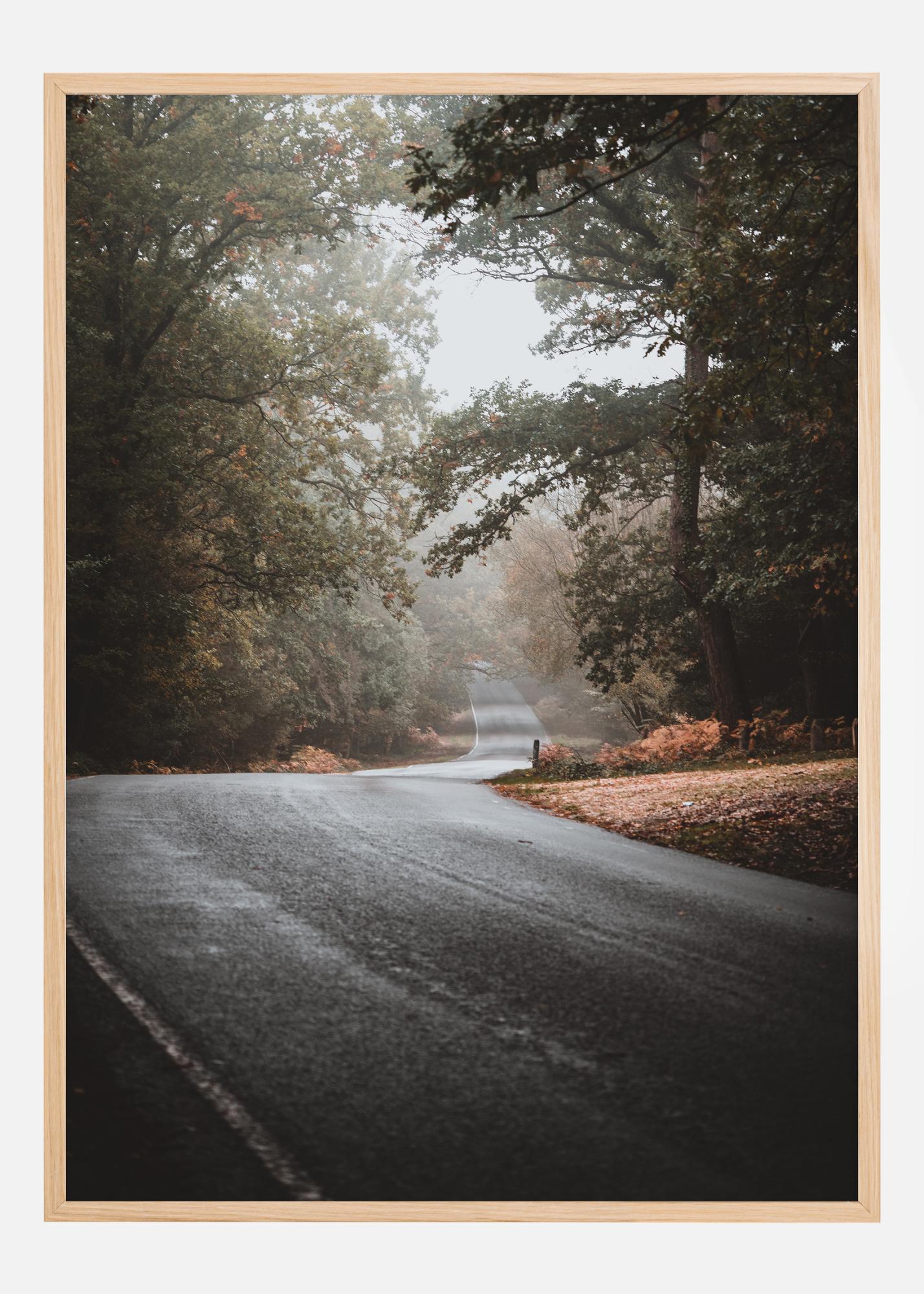 This atmospheric poster captures the calm essence of an autumn road surrounded by deciduous forest. The mist hovering over the road and the trees' red and green autumn leaves evoke a sense of mystique and change. The wet asphalt subtly reflects the forest's colors and contributes to the overall feeling of depth and introspection that the image conveys.