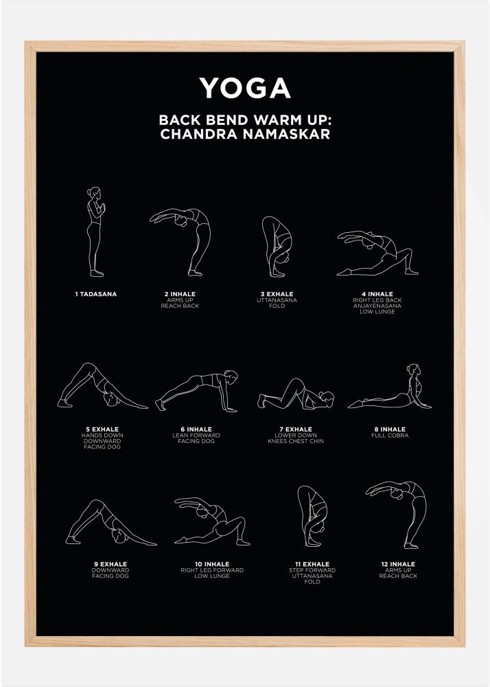 Trendy poster that can be advantageously matched with other motifs to create a trendy picture wall. The poster is stylish with a minimalist design, but also serves as a helping hand when you want to learn one of yoga's classic warm-up exercises "Chandra Namaskar". The poster is available in black or white and in a variety of sizes.
