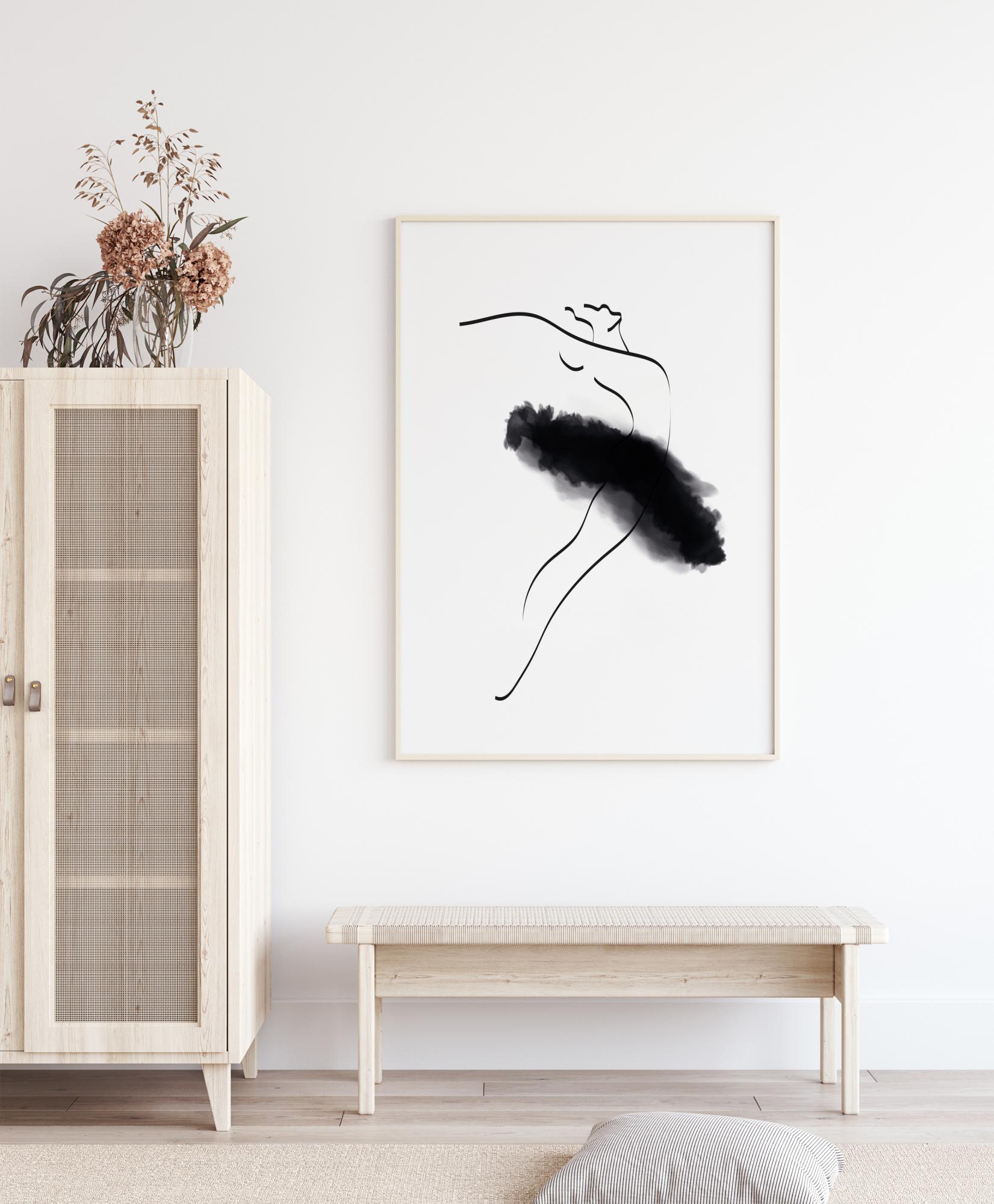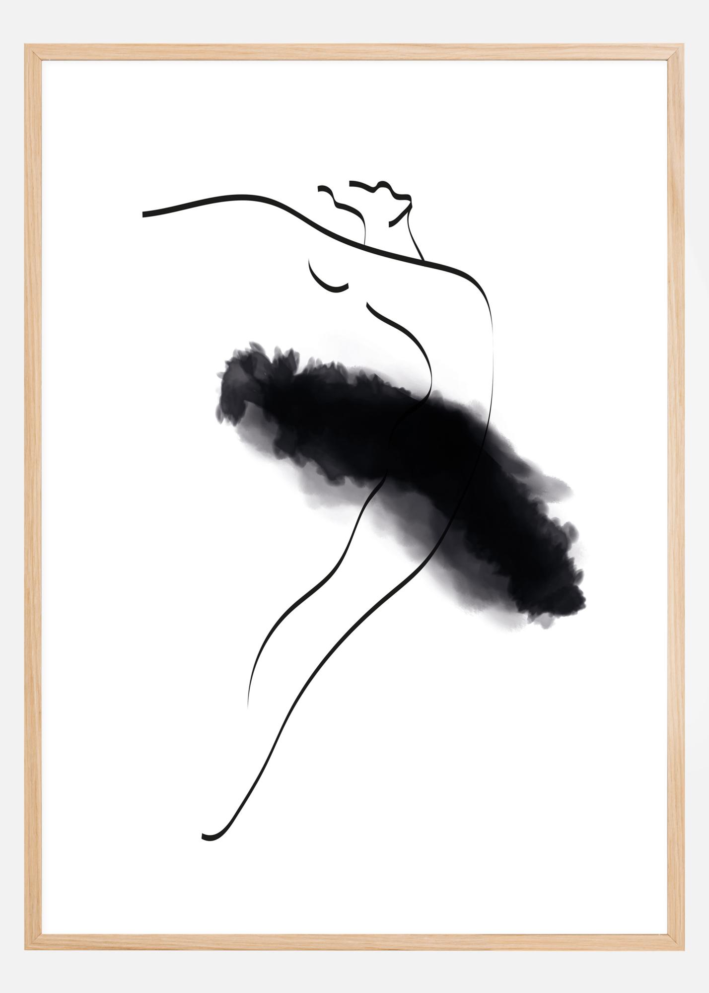 A watercolour of a ballerina in thin black lines with a more pronounced black ballerina skirt. A minimalist and stylish poster that fits just as well in the bedroom or hallway, as in the living room or in the library.