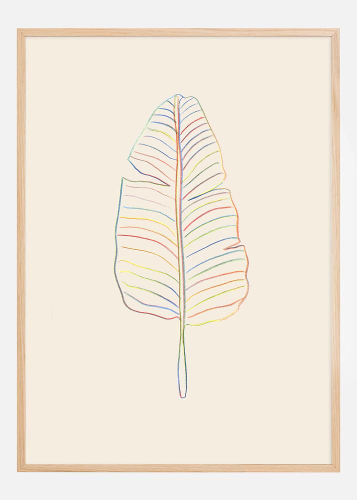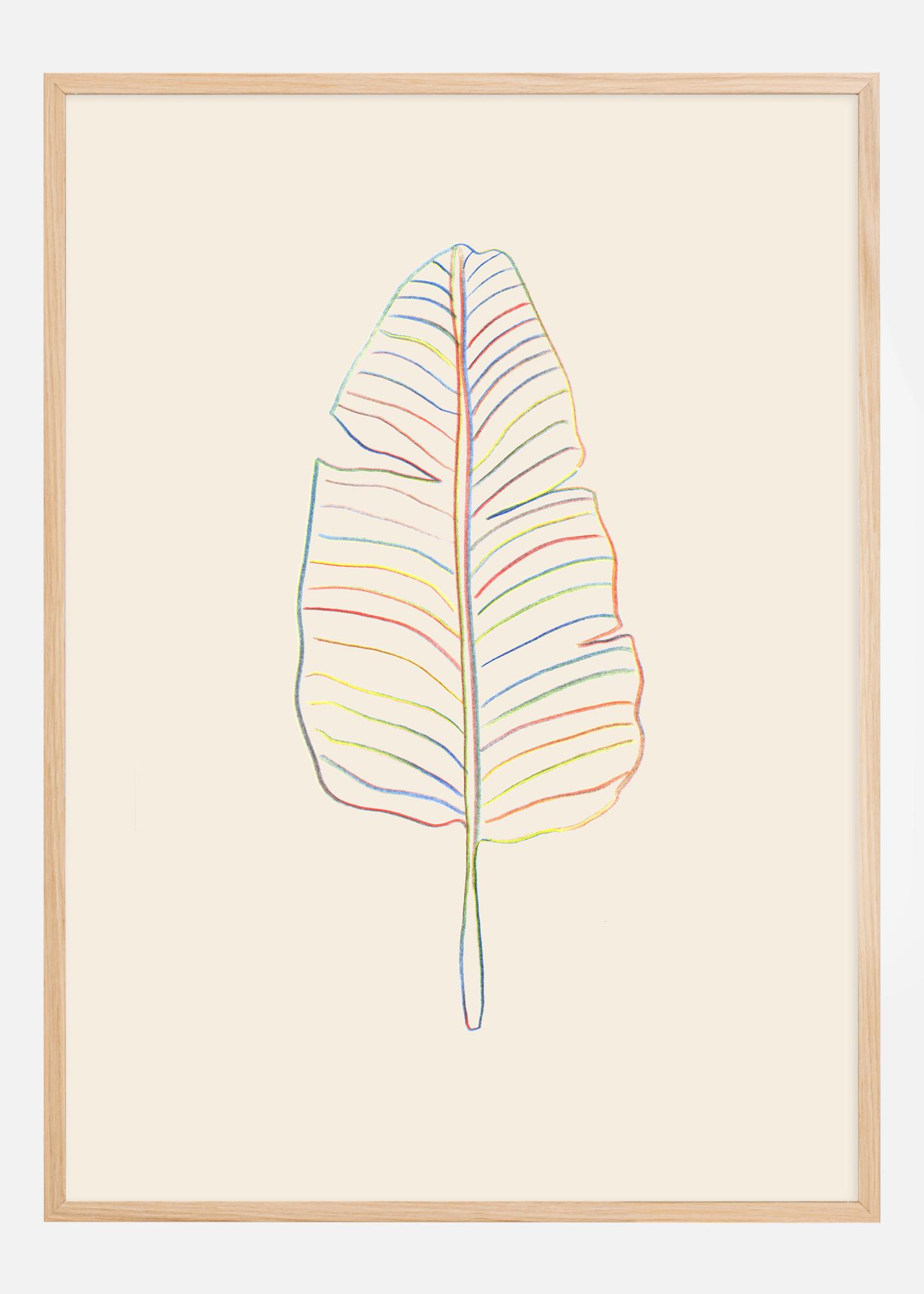 This vivid and colorful poster depicts a creative interpretation of a banana leaf with lines in a spectrum of rainbow colors. The playful contrast between the natural shapes of the leaf and the playful colors gives a modern twist on classic botanical art. This print is an excellent representation of how classic motifs can be transformed with a pop of color to suit a modern aesthetic.