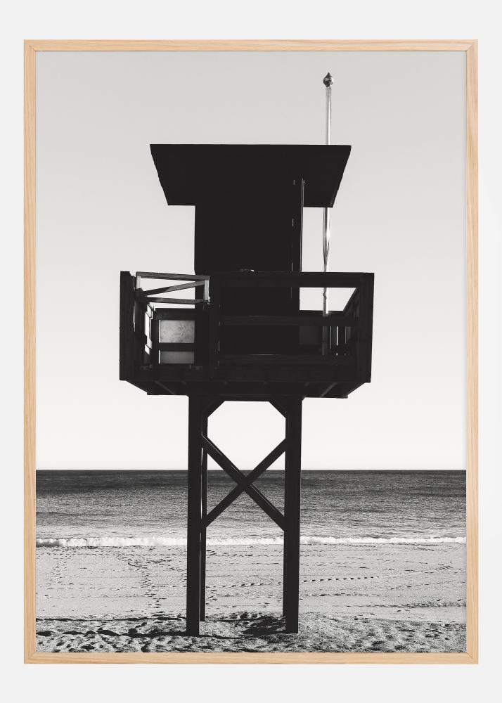 This monochrome poster features an iconic silhouette of a lifeguard tower against a clear sky and calm sea. The strong contrast between the dark lifeguard tower and the light tones of sand and sky gives the image a graphic quality that is both striking and contemporary. The image, taken at eye level, creates a sense of presence and calm, as if standing directly on the beach looking out over the vast sea.