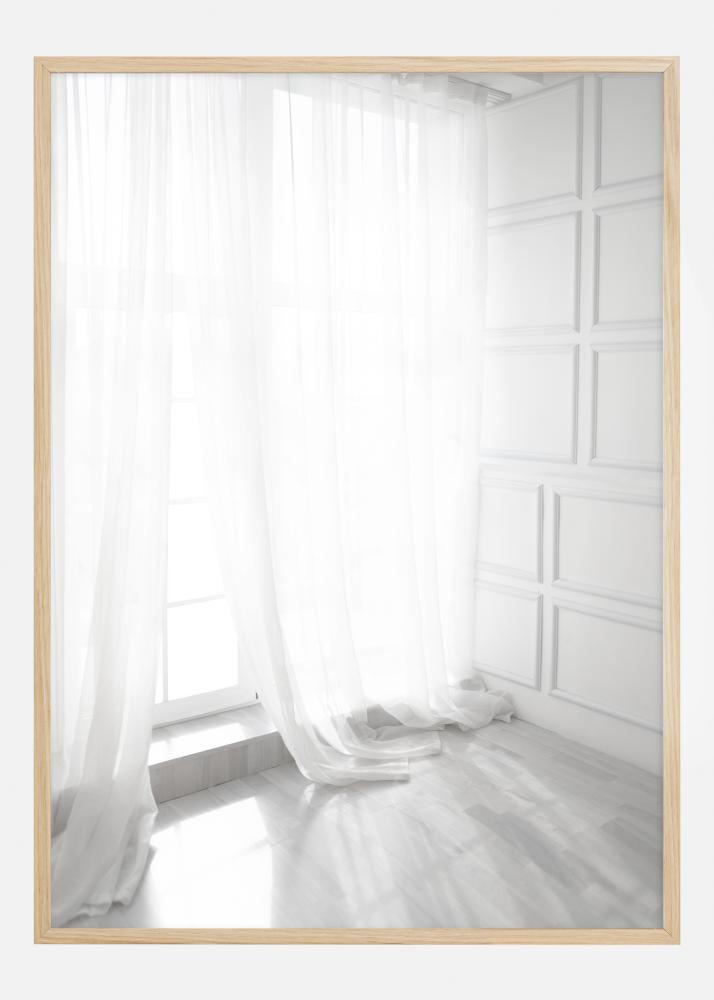 This calm and purifying poster depicts a quiet corner of a room draped with sheer white curtains. The light filtered through the fabric creates a play of shadows and nuances on the glossy floor, giving a sense of tranquility and clarity. This minimalist print is an expression of stillness and would fit perfectly in an environment striving for simplicity and peace.