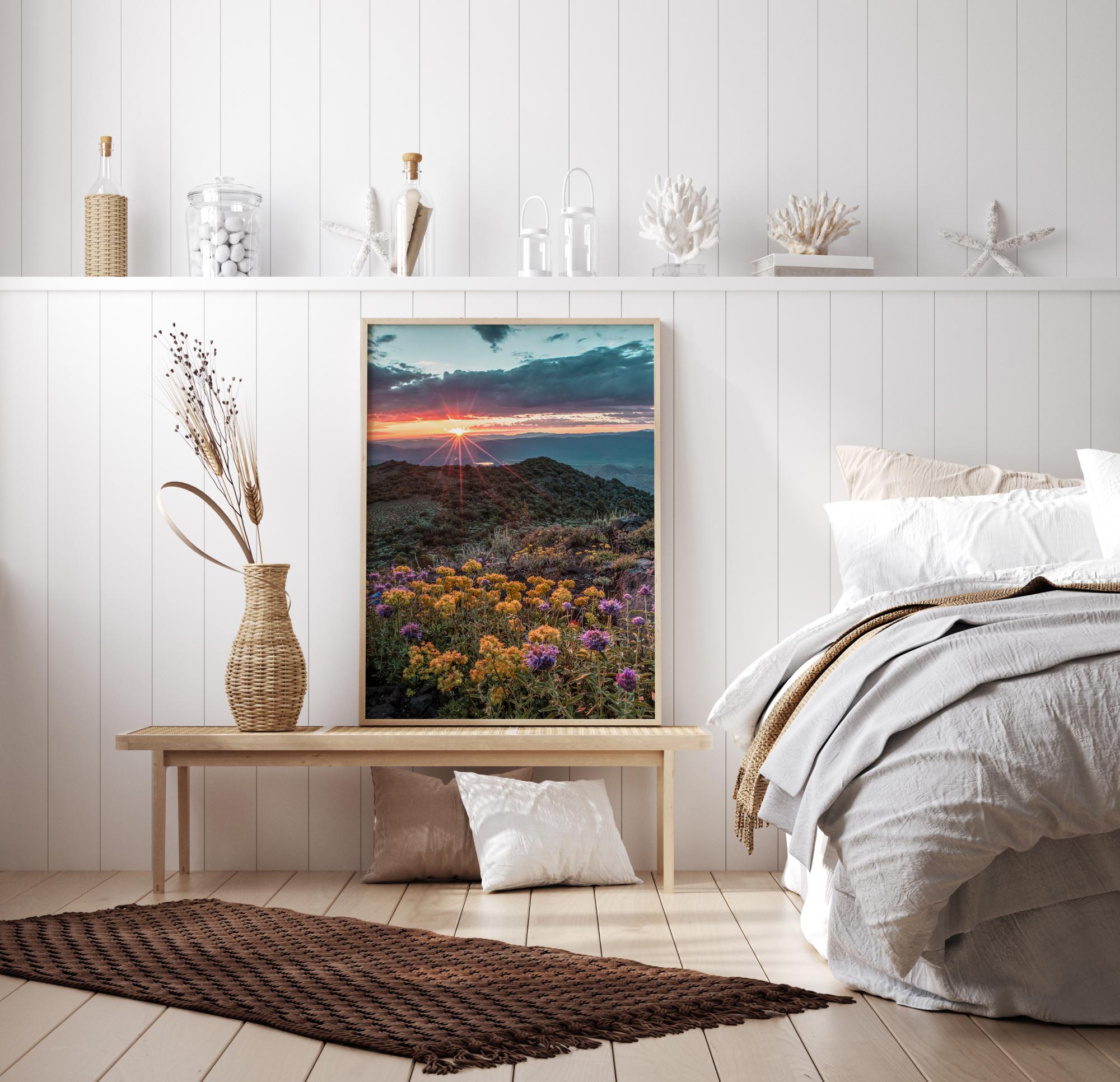 A nature poster of wild flowers on a mountainside with a stunning sunset. Beautiful yellow and purple flowers fill the picture leading your eyes back to the mountaintops and the darkening sky. The sunset beams out like a red star providing a focal point. Add this to your wall for a natural feel.