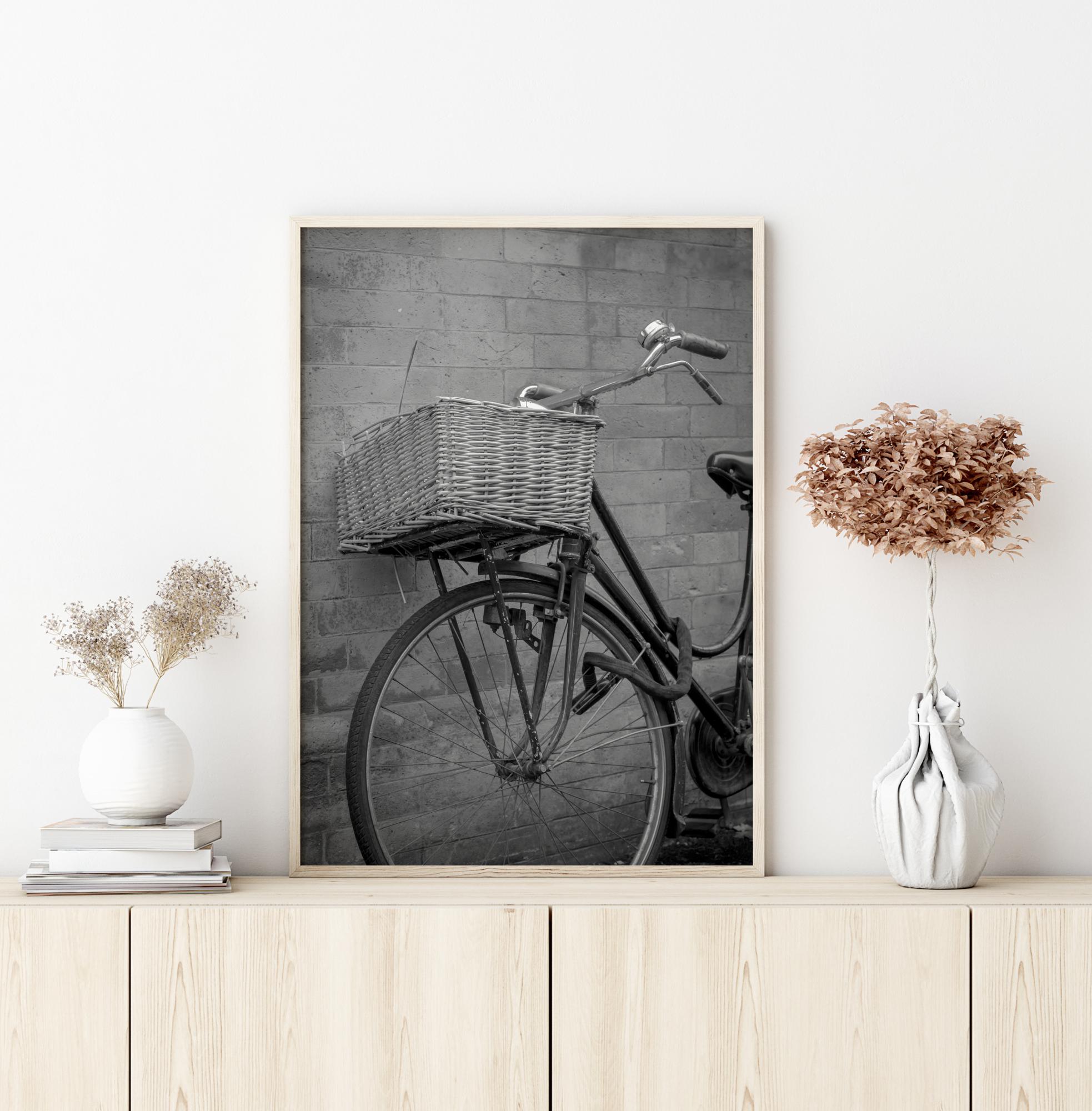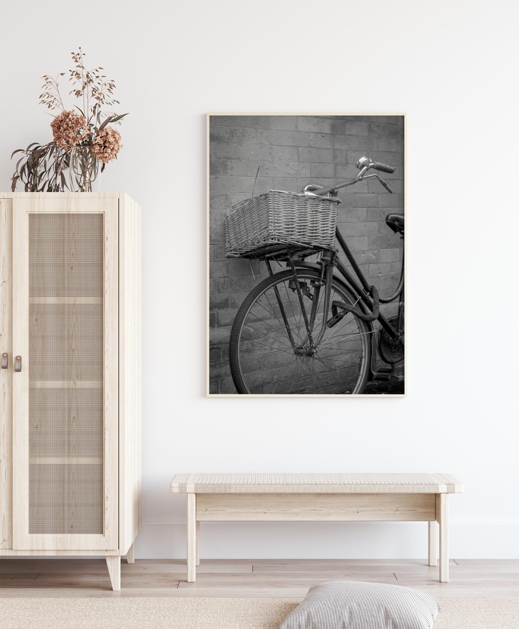 A still life poster of a bicycle leaning against a brick wall. The wicker basket of the bike is the focus as it leans on the wall. The strong black frame and bike lock lead the eye around the poster. Add this simple piece of elegance to a bright wall for a tasteful look.