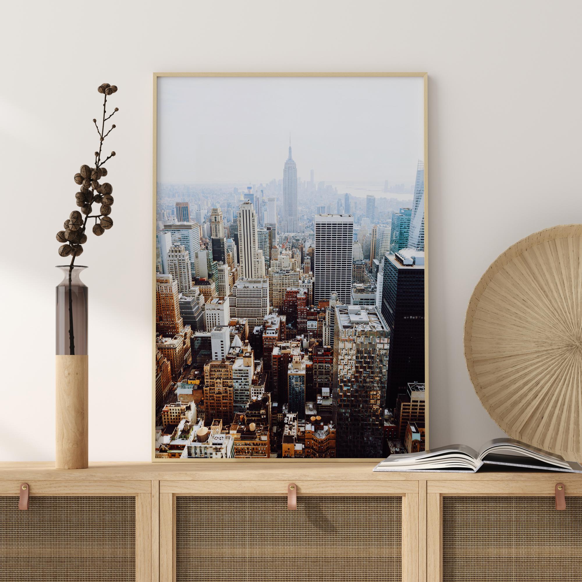 An aerial poster of the New York cityscape with the Empire State Building in the distance. In the foreground, the colours start off as golds and yellows before blending into the background as colder blues and greys. As the image loses focus, depth is created. Bring this home as an artistic look at city life.