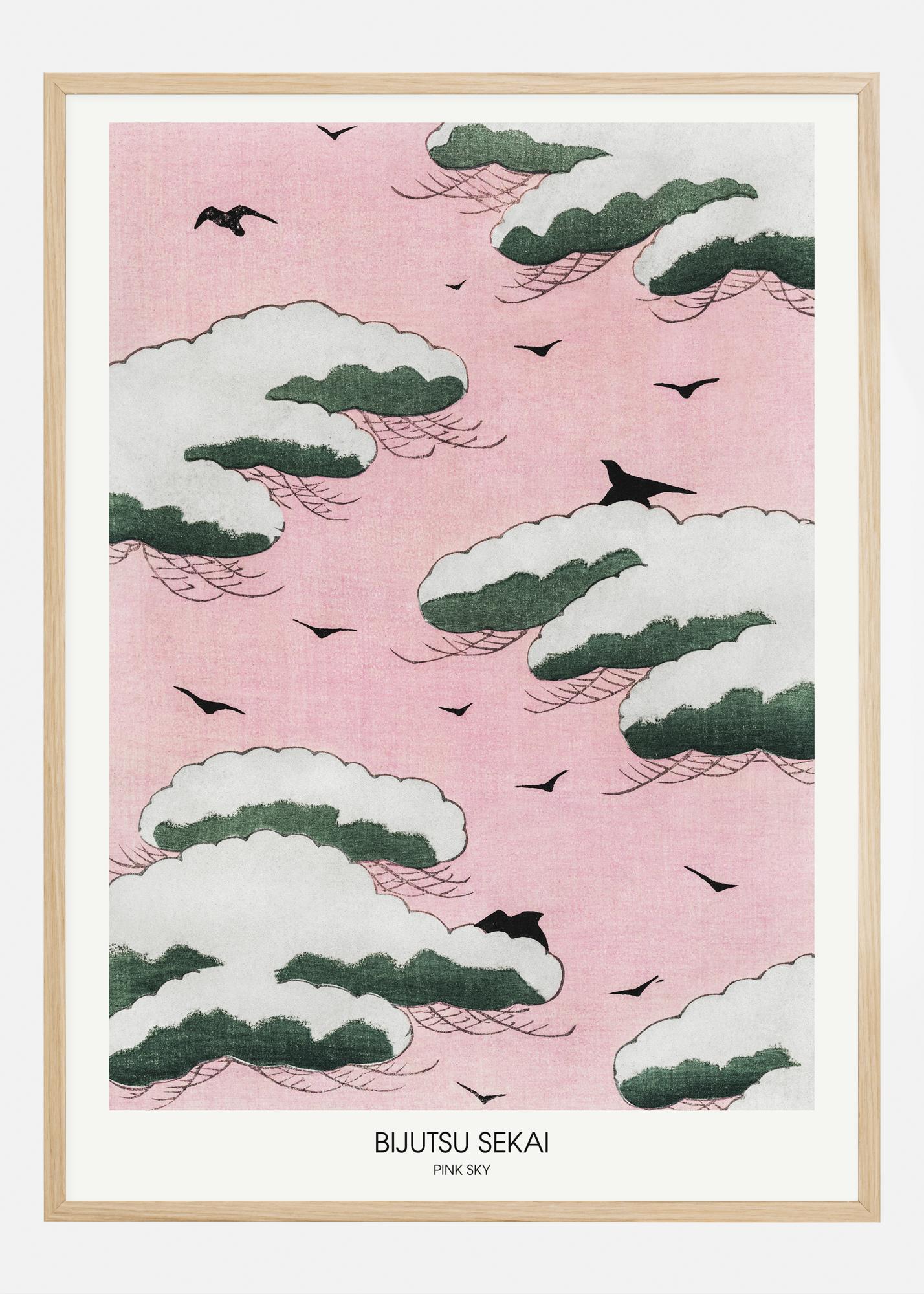 This soothing and poetic poster titled "Bijutsu Sekai Pink Sky" captures the essence of a tranquil morning or evening with its soft pink sky as a backdrop to elegantly drifting clouds and silhouettes of flying birds. This print is an oasis of calm and would fit perfectly in a bedroom or meditation space where it can evoke a sense of peacefulness and reflection.