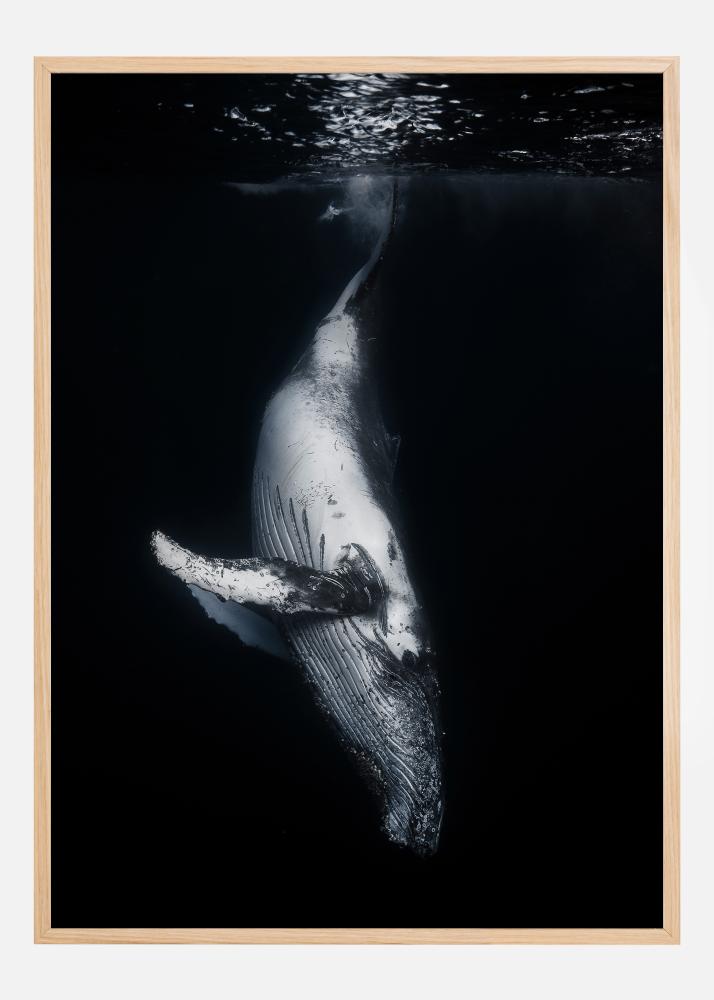 In this depicted poster, a humpback whale is gracefully gliding through dark waters, an image that captures the essence of marine life. The contrasting black and white composition highlights the whale's textured skin and the elegant contours of its body, creating a powerful image of tranquility and grace beneath the surface.