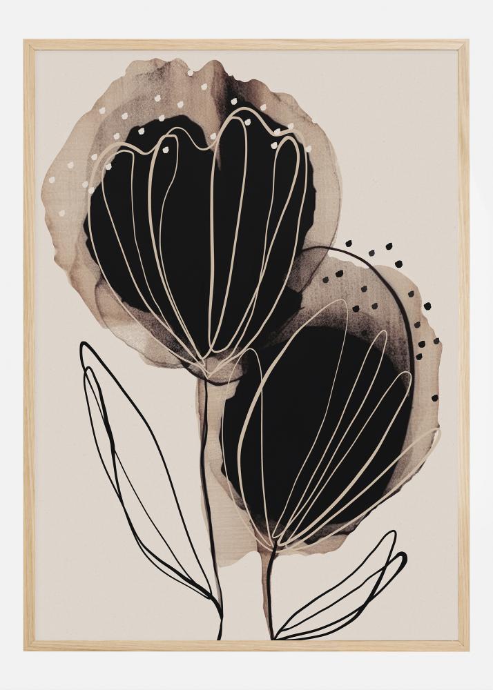 The color palette is limited yet powerful, with black and white details highlighting the graphic lines of the flower forms against an earthy color background. This print is perfect for adding a contemporary touch to any room and is especially prominent in minimalist or modern environments where its sleek beauty can take center stage.