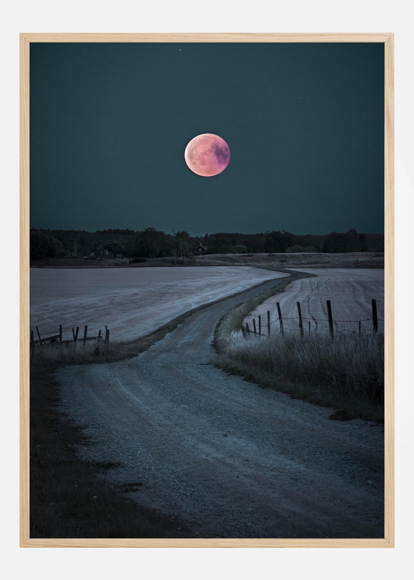 A stunning poster of a snow-covered landscape with a bright red blood moon in the centre. A road moves into the distance drawing the eye right to the moon hanging low in the sky. The greys and blues stand out against the red and pink of the moon to create a sense of awe in this night-time shot.