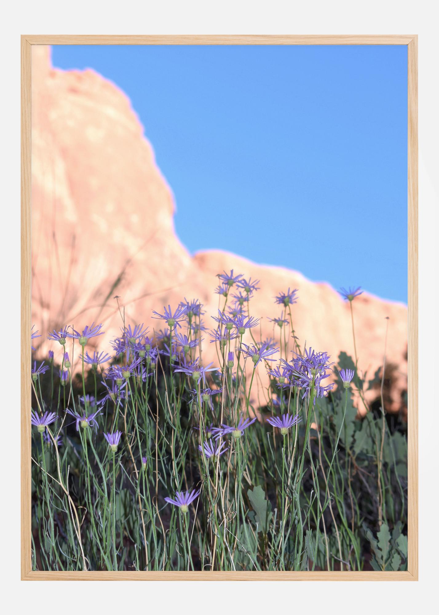 A dazzling natural poster with purple flowers, rocky mountains and a strong blue sky. The purple cornflowers are the focus reaching up to the sky and setting off the orange rocks and the wide expansive sky. Get lost in nature when you bring this print home and hang it in your bedroom.