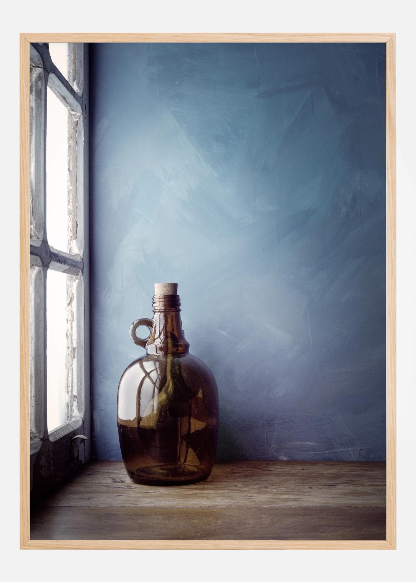 A still life poster of a brown bottle against a blue wall. Light from a window shines in from the left illuminating the bottle and casting reflections. Add a rustic feel to your home with the soft blue wall and the old wooden table where the bottle sits.