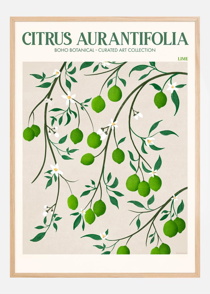 This elegant and sophisticated poster features Citrus aurantifolia, known as lime, from our BOHO Botanical - Curated Art Collection. The artwork beautifully depicts green limes dangling from branched twigs, surrounded by soft white flowers against a neutral background. Each element in this poster is carefully crafted to reflect the freshness and vitality of limes, making it a wonderful addition to kitchens or living rooms, and also in commercial spaces such as cafes or restaurants that value a natural and organic atmosphere.