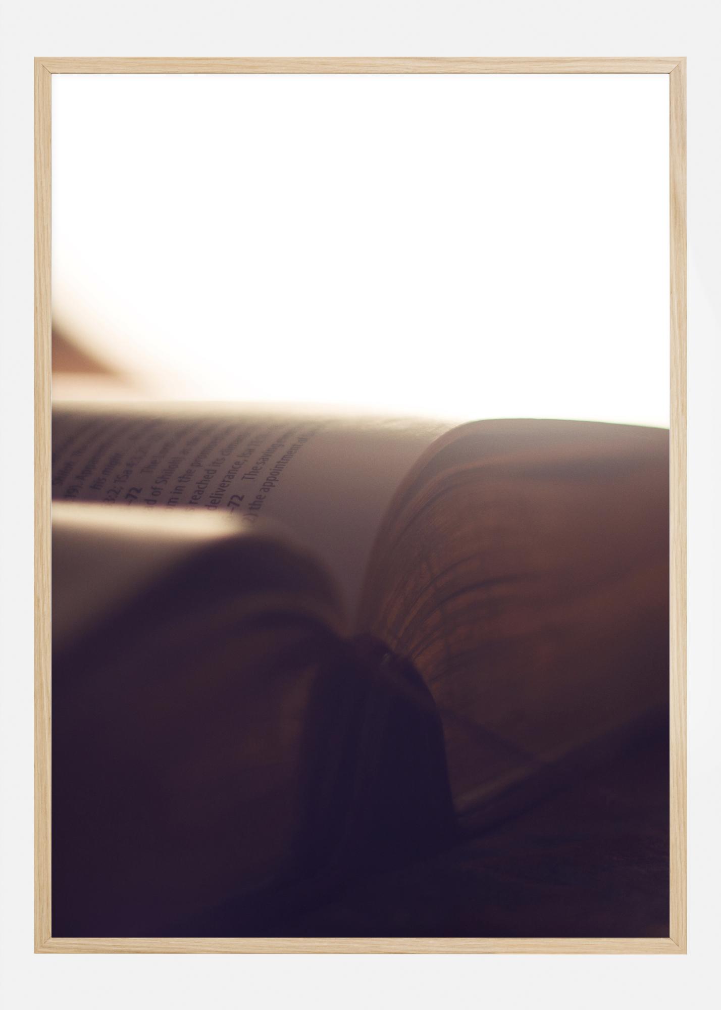 A close-up poster of the side of a book. Bright white light fills most of this image as it shines down on the book illuminating the gold gilt edges of the pages. The book curves open with words just visible on the page. It's the perfect print for a study room.
