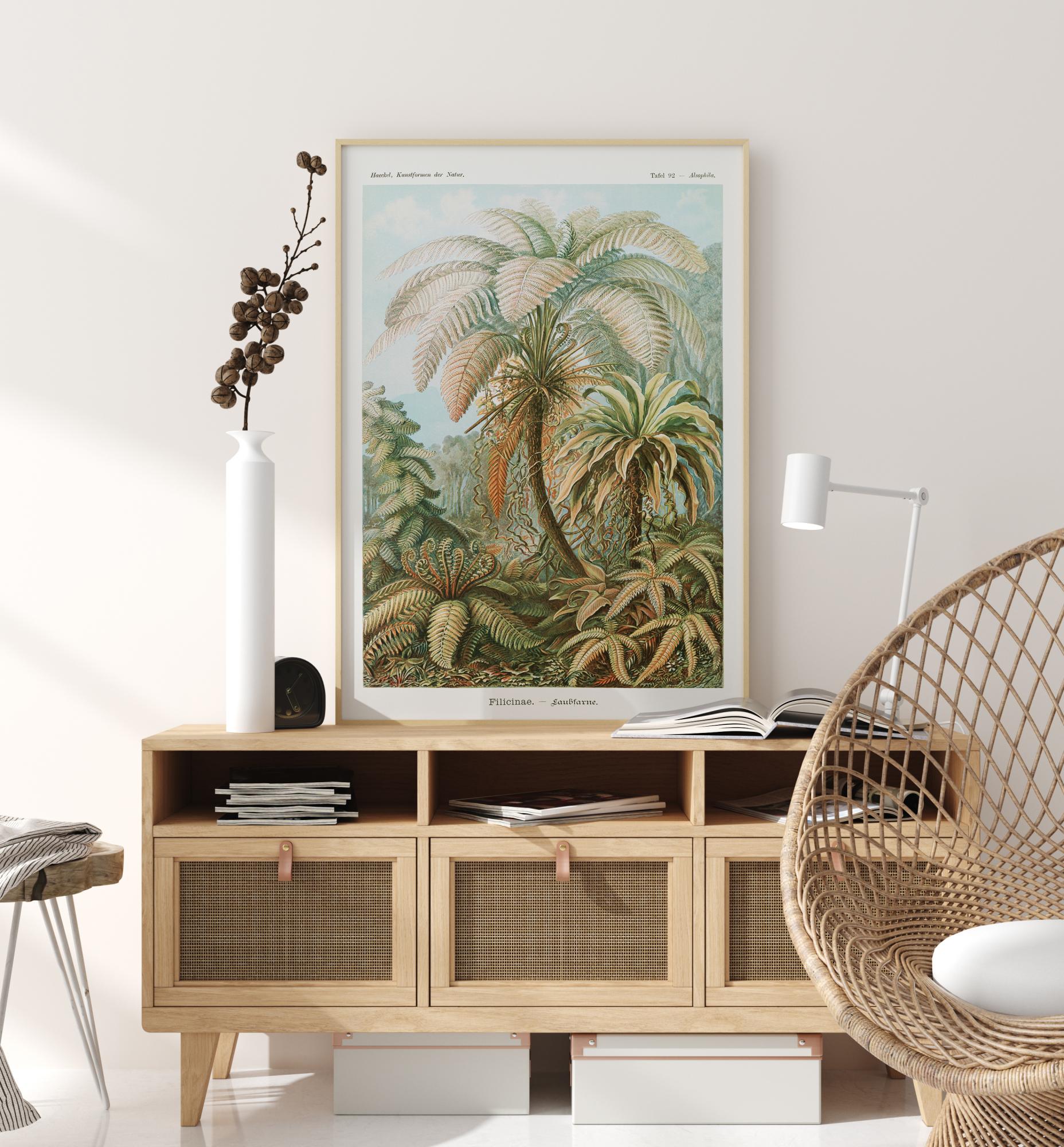 An illustration poster of various botanical plants. Large palm fronds and ferns sprout up throughout this image. Greens, blues and oranges create a soft tone in this antique German scientific drawing. Bring a touch of the old into your house with these plants and their Latin names.