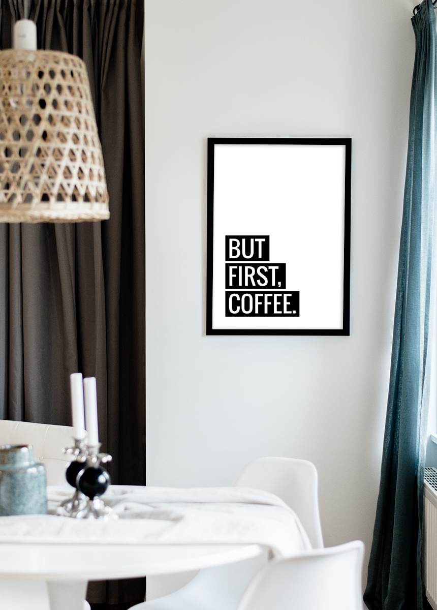 Travel the world, start your own business, learn to juggle while balancing on a super thin wire! But first – coffee. This stylish poster suits those who see the wonderful drink as an important part of everyday life. Hang it above the kitchen table or in the office! The poster is white with the text "But first, coffee" in white against a black background. The black and white design works excellently with a frame or passe-partout in an exciting colour. Choose between 6 different formats.