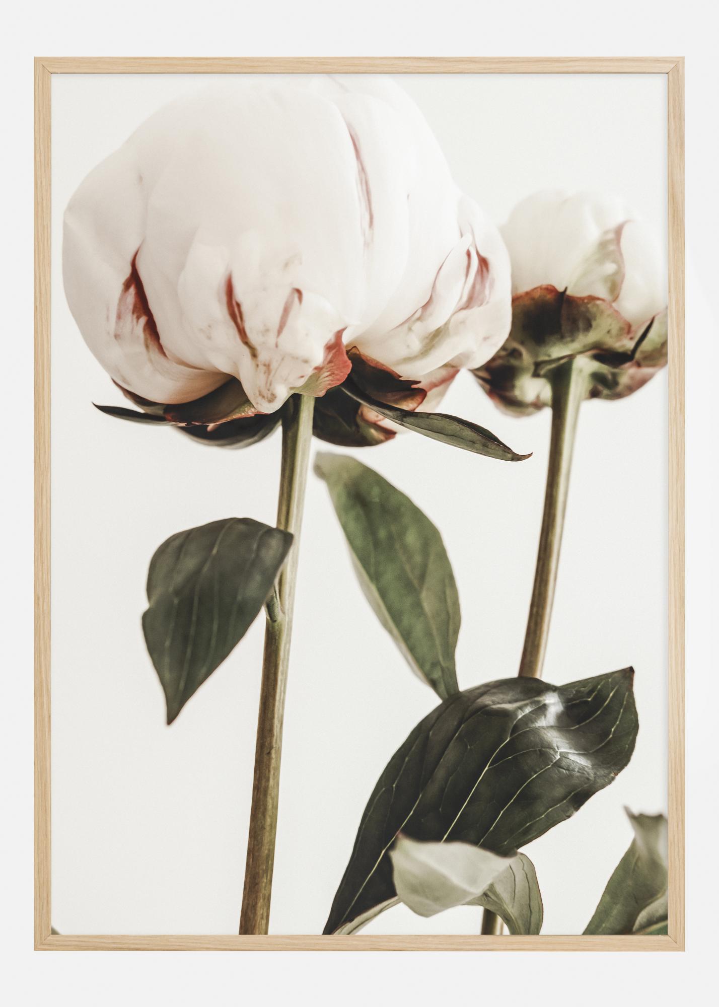 This poster captures the outstanding beauty of peonies in full bloom. The large, fluffy flowers, with their softly folded petals in shades of white and rust red, stand proudly on their strong stems. The deep green leaves form a powerful backdrop that highlights the flowers' delicate structure and rich tones.