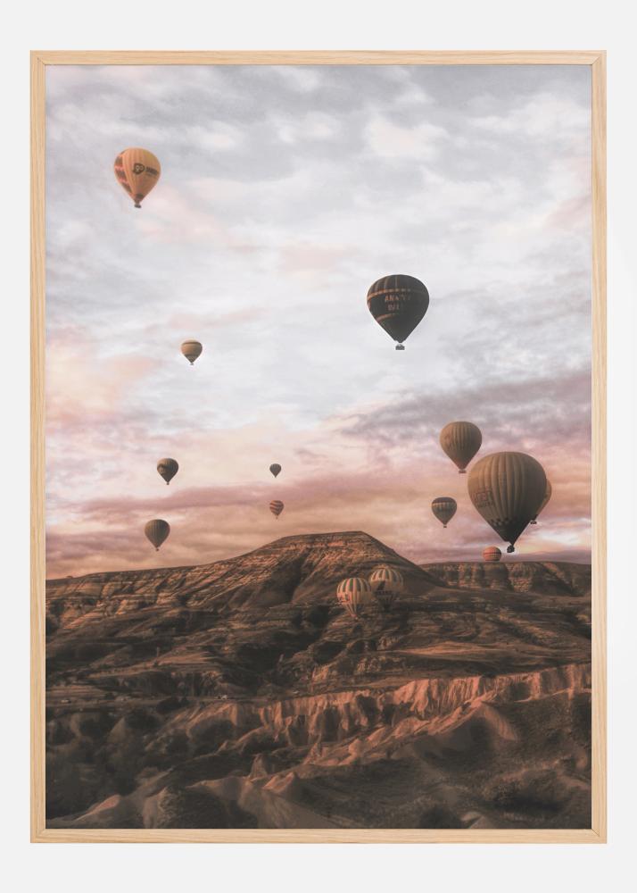 A magical landscape poster of Cappadocia with hot air balloons flying overhead. Soft pink rocks are lit up by an unseen sun that also gives a rosy glow to the cloudy sky. Hot air balloons float upwards. Get an uplifting feeling when you hang this at home.